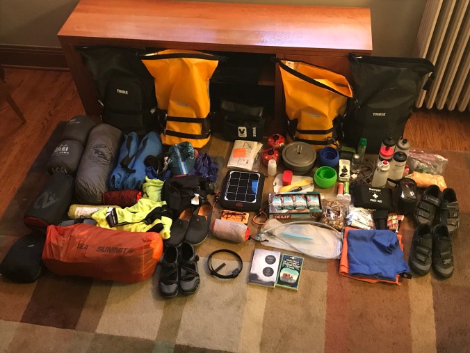 Some have asked what we are bringing, so here is a picture. From left to right, sleeping bags, tent, pads, tiny camping chairs, clothes (Lisa’s are in the orange stuff sack), maps, technology (including a borrowed solar collector), cook kit and stove, first aid kit, a couple books, bike tools, Clif bars, water bottles, shoes. In the back, our four Thule panniers and a handlebar bag which Lisa will be carrying.
