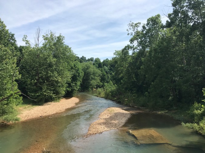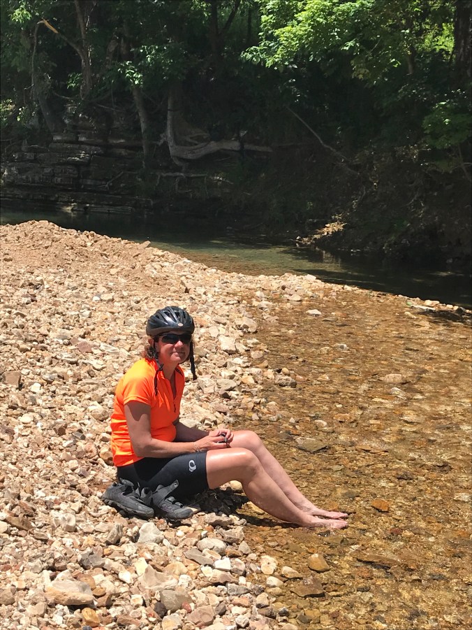 We passed over many beautiful creeks and finally stopped at one, taking off our shoes to wade in the cold, clear water, and then rode into Waverly for lunch. I had sent a note to a lovely fellow who lives outside of Nashville, a friend of my friend Lynne, Paul Binkley, who is a terrific musician and composer and who likes to bike. We had a spirited conversation last December about many things including biking, after a performance of Lynne’s Christmas show, and he said he’d like to bike with us on the Natchez Trace for a day if time permitted. In Waverly, I found a text from him, once we had a signal, and it turned out that he could not bike with us but was wondering if he could bring us or take us out to dinner. Which was an INCREDIBLE offer since I had met him ONCE, and since our planned stop for the night was on completely the opposite side of Nashville.
