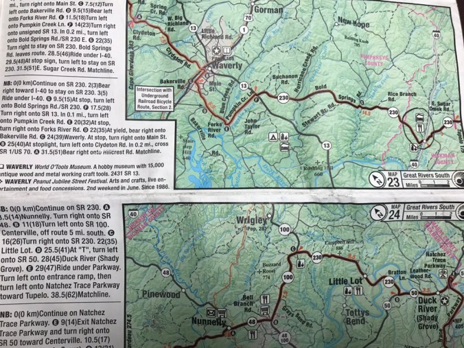 There are lots of pictures on this blog of Dan looking at maps (including the one above, from this morning) because we spend a lot of time with them, trying to figure out where we are, and where we are going next. Every morning before we leave, every evening when we have stopped cycling for the day, and a couple of dozen times in between, we are studying the maps, which came from Adventure Cycling in Missoula, Montana. Most days we complete about three segments of a map. On the left hand side of each map segment are the turn-by-turn instructions for that segment, which differ for southbound or northbound bike travelers, and show, for example, that Waverly has restaurants and grocery stores and places to stay (represented by a star), and that it was on Pumpkin Creek Lane that Dan was chased by six or seven dogs (okay, that is not on the map but I know that’s where we were, and they all got tired out from chasing him before I came along).