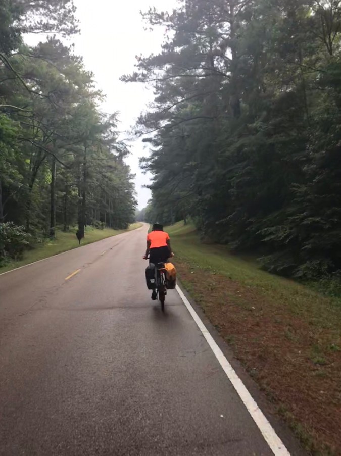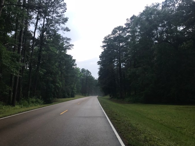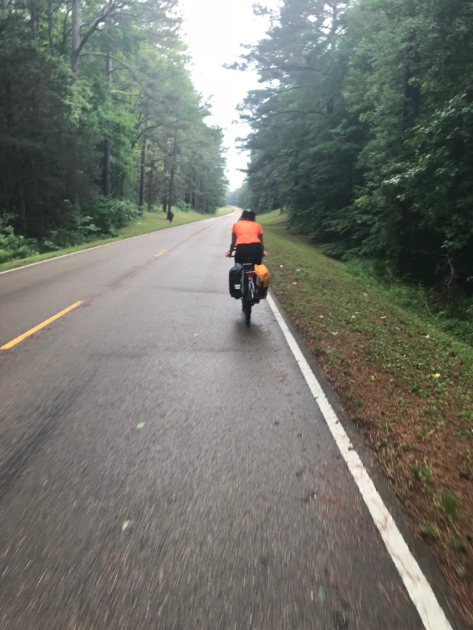 A few miles farther on, about 20 miles out from the end, we stopped at French Camp for some iced tea. As we sat in the front porch of the cafe, two couples walked up in their biking kit. I asked where they’d ridden from and they first said “we’re from Belgium… and rode from Tupelo.” Which perplexed me. We’d not seen them at all. I asked when they left and one guy said “9:00.” Then I said, because my inhibitions are gone, “how did you get here so fast?” Because we’d left nearly three hours earlier and we’d just arrived. Then I looked over at their fast carbon fiber bikes and looked at our fully loaded beasts. Then one of the women said “we have a van and are taking turns riding.”