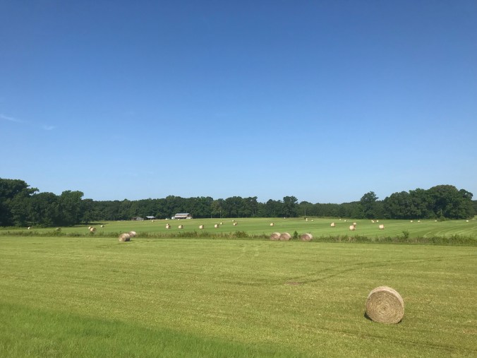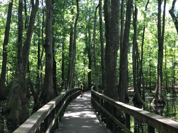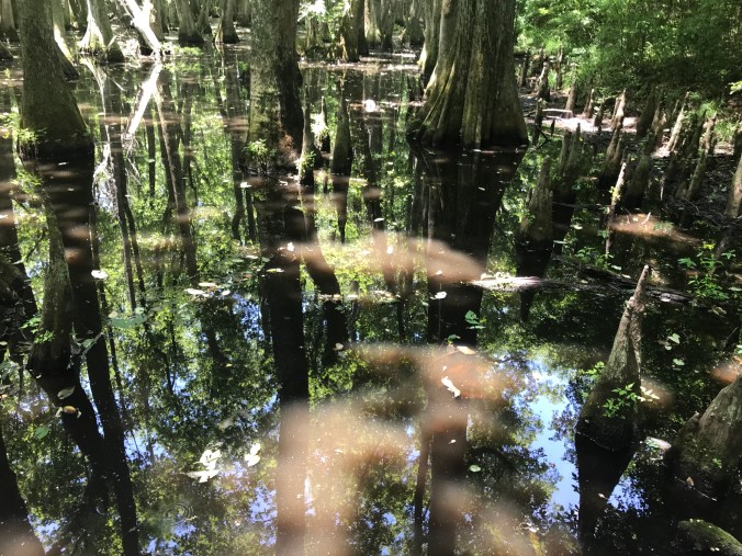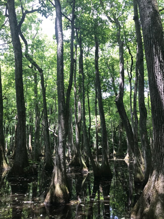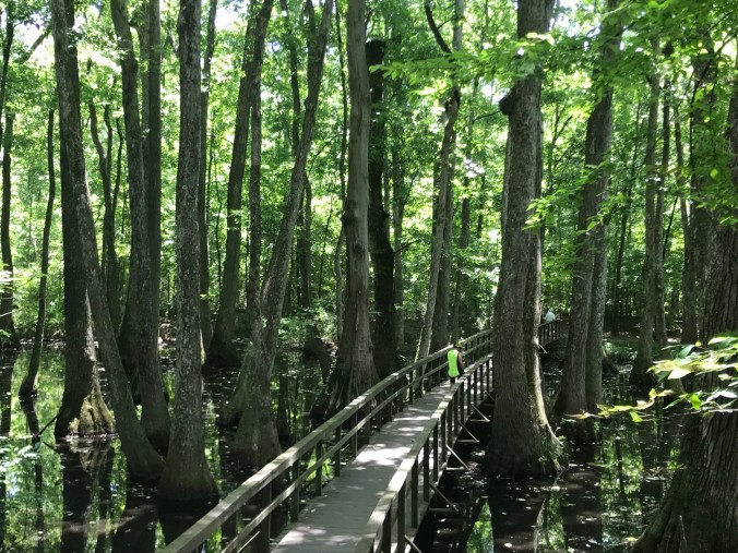 This morning we headed off after breakfast while it was still cool, and traffic was light. The first half of the day went by very quickly; I don’t think I got a good photo of the many fields filled with rudbeckia/black eyed Susan’s, though you can see the blue skies and hay bales and reservoir that we rode along for miles and miles, watching the boaters and swimmers with some envy (as that seemed much more pleasant than riding on asphalt in the afternoon). One of the highlights of the day was a stop in the cypress swamp, looking at these big beautiful trees growing in water.