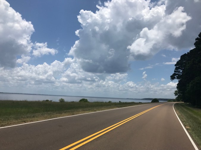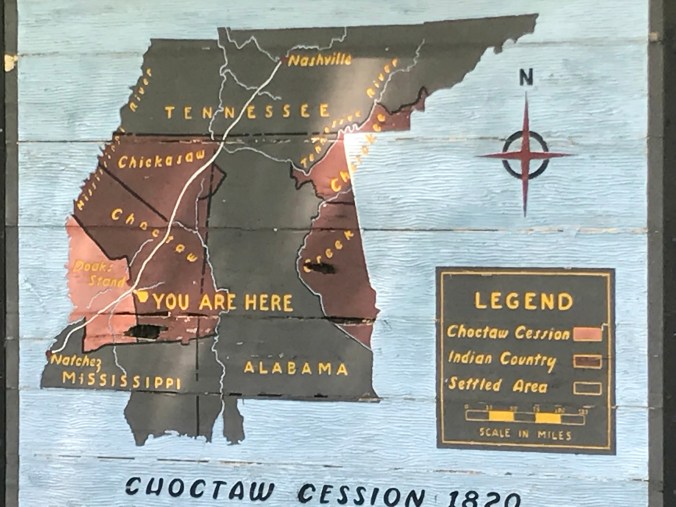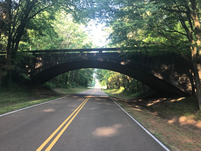 Yesterday we had our first 100+ mile ride of the trip, and it was a long but beautiful day. The last two hours were particularly memorable…rain had passed through before we left French Camp, a little settlement where there is a Baptist church and cafe and school for troubled students (and where Oprah’s mom lives, evidently)…we could hear thunder so rode as fast as we could through woods covered in mist, with little to no traffic, and it was eerie and beautiful and we were each in a meditative state when we finally exited the Trace, thinking about all of the tribes and troops and settlers who had spent time in those woods.