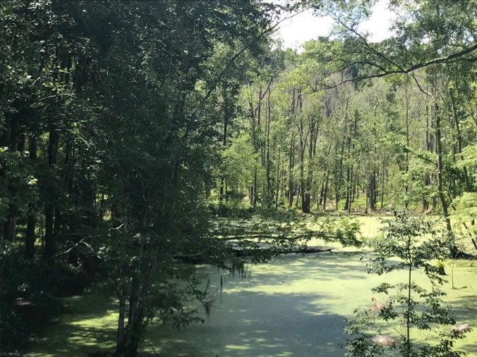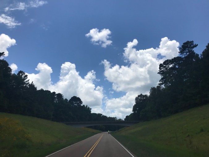 This afternoon we finished our ride on the Natchez Trace Parkway, and felt both giddiness and loss as we counted down the mile markers to zero …. it was a tremendous biking experience. For more than 400 miles we were on a nationally maintained, historic roadway and the land adjacent to it. We entered it in the same way we started off on all of the other parts of the trip — with some sense of the towns and sights along it and high hopes for light traffic — but what we did not expect before starting was the quiet that we frequently experienced. Sometimes 15 minutes or more would pass before we would see a car or truck or RV, and in that time we would hear the quiet whir of our bike tires on pavement and the clink of our shifting gears, and the sounds and songs of birds in the woods around us, and maybe a far off tractor or mower, or water dripping off of rocks, or a cow or rooster making itself known.