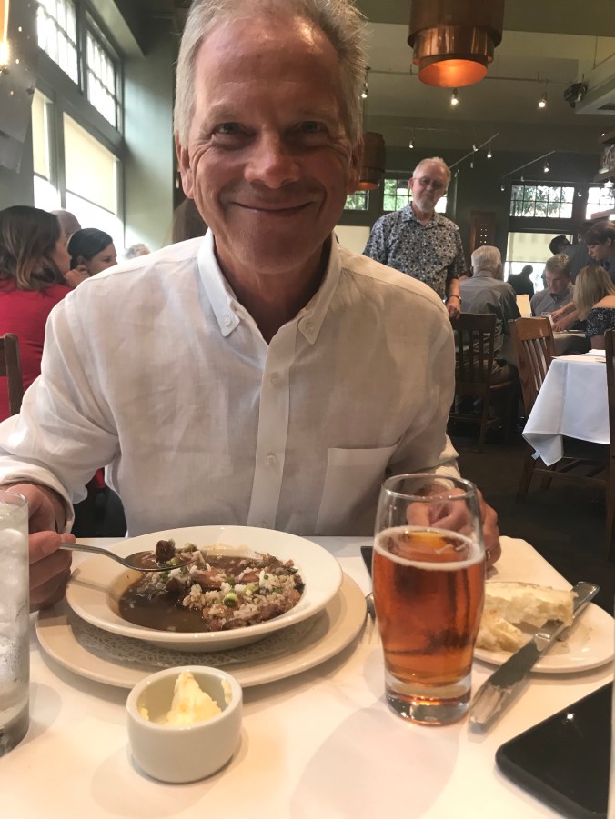 The afternoon was spent in part by the hotel pool reading, and later I went off to find a salon for a pedicure while Dan took a nap (we are now doing vacation things!) We were delighted to discover prosecco and chocolate-covered strawberries in our room with a congratulatory card from the Gergen-Burkes, which was a very generous surprise, and later headed out for dinner at Herbsaint, which came highly recommended by friend Melissa B. Dan sent her a note telling her we had a reservation for last night, and she replied, “I have three words for you: Get The Gumbo.” And we did, and it was sublime, as was the rest of the meal.
