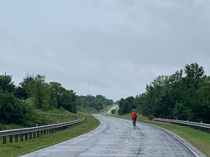 The next day (Wednesday) was predicted to be rainy and it didn’t disappoint. Fortunately, we were mostly packed up before it got bad, but it did rain pretty much the entire way to Moberly, which is the biggest town on our trip. Riding in the rain isn’t terrible once you accept that you’re going to be wet. We dressed warmly and wore our bright orange Showers Pass jackets, the closest we’ll probably ever get to matching his and hers apparel.