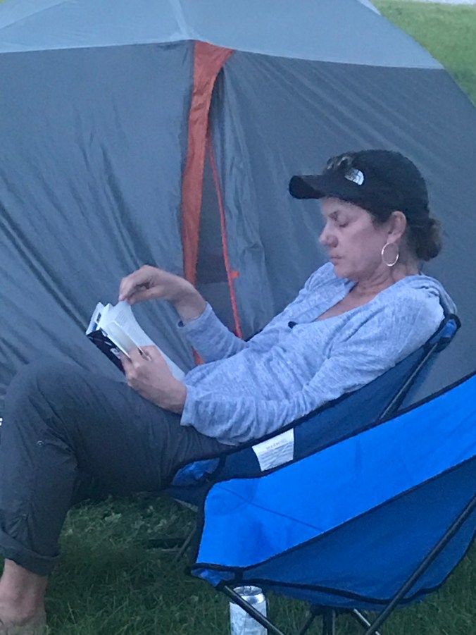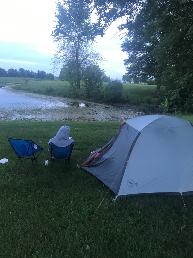 After dinner, waiting for the shuttle to come around, we chatted with a young family from Centralia who’d come to Moberly for their eight year old son’s baseball game (rained out.) The dad ended up offering to drive us back to the park where we are camping and we accepted, rather than wait for the single, very busy shuttle.