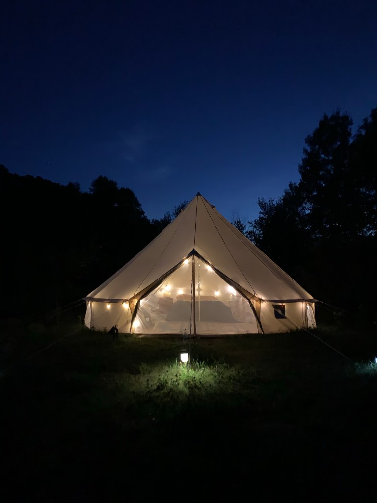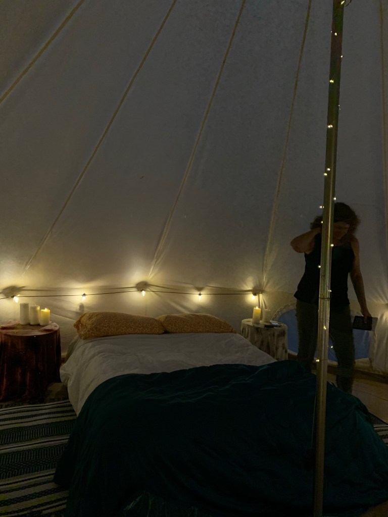 We’re staying in a yurt on a farm called Dancing the Land, a CAS run by a young couple (this was her family’s farm, though they moved back here from Mendocino County in California.) They offer this huge tent with a lovely bed and an insect free (mostly) cook tent to people like us, I guess.