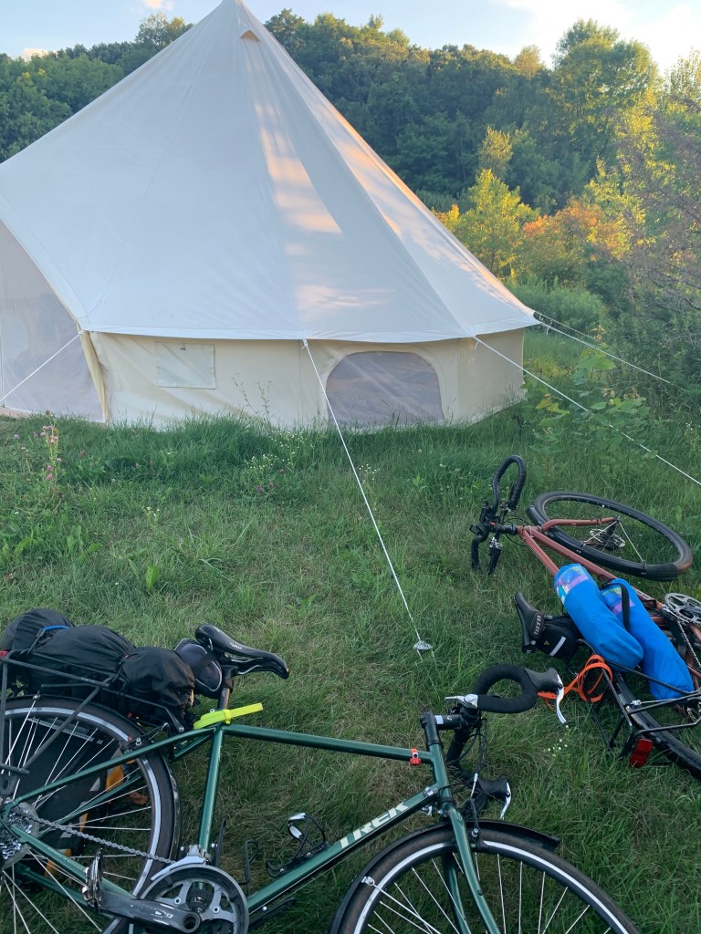 We rode out of Minneapolis, through many suburbs, into cornfields, and north on a county road that parallels Interstate 94. It was sunny, but beautiful, not too hot. It seemed like the river was never more than 100 yards to our right, with lots of nice houses on both sides. We pulled into Clearwater around 4:30, picked up some groceries and headed out to our Glampsite 6 miles out of town. Those 6 miles were the most hairaising of the day – on narrow roads with no shoulders, and the last 1/2 mile on gravel.
