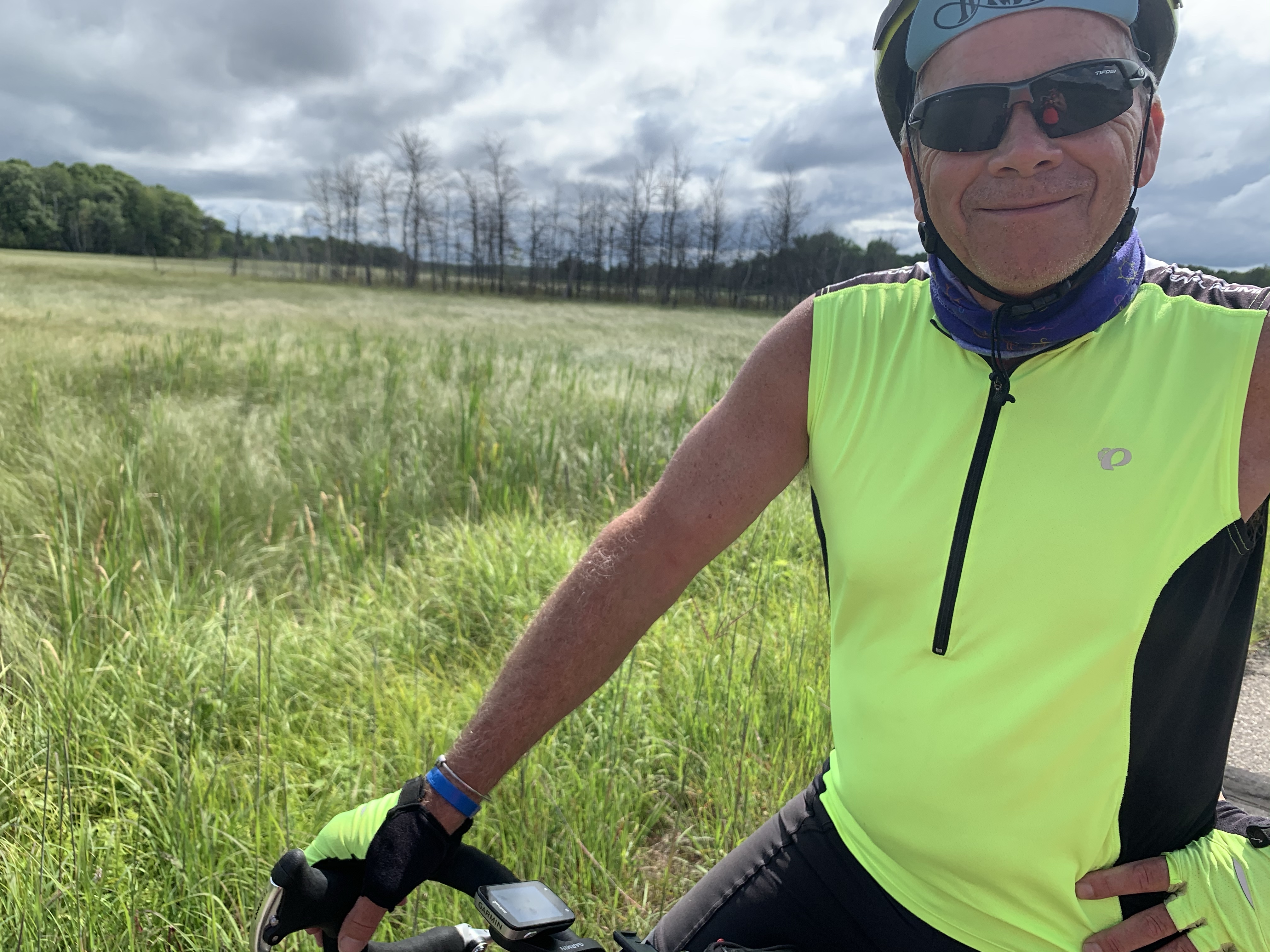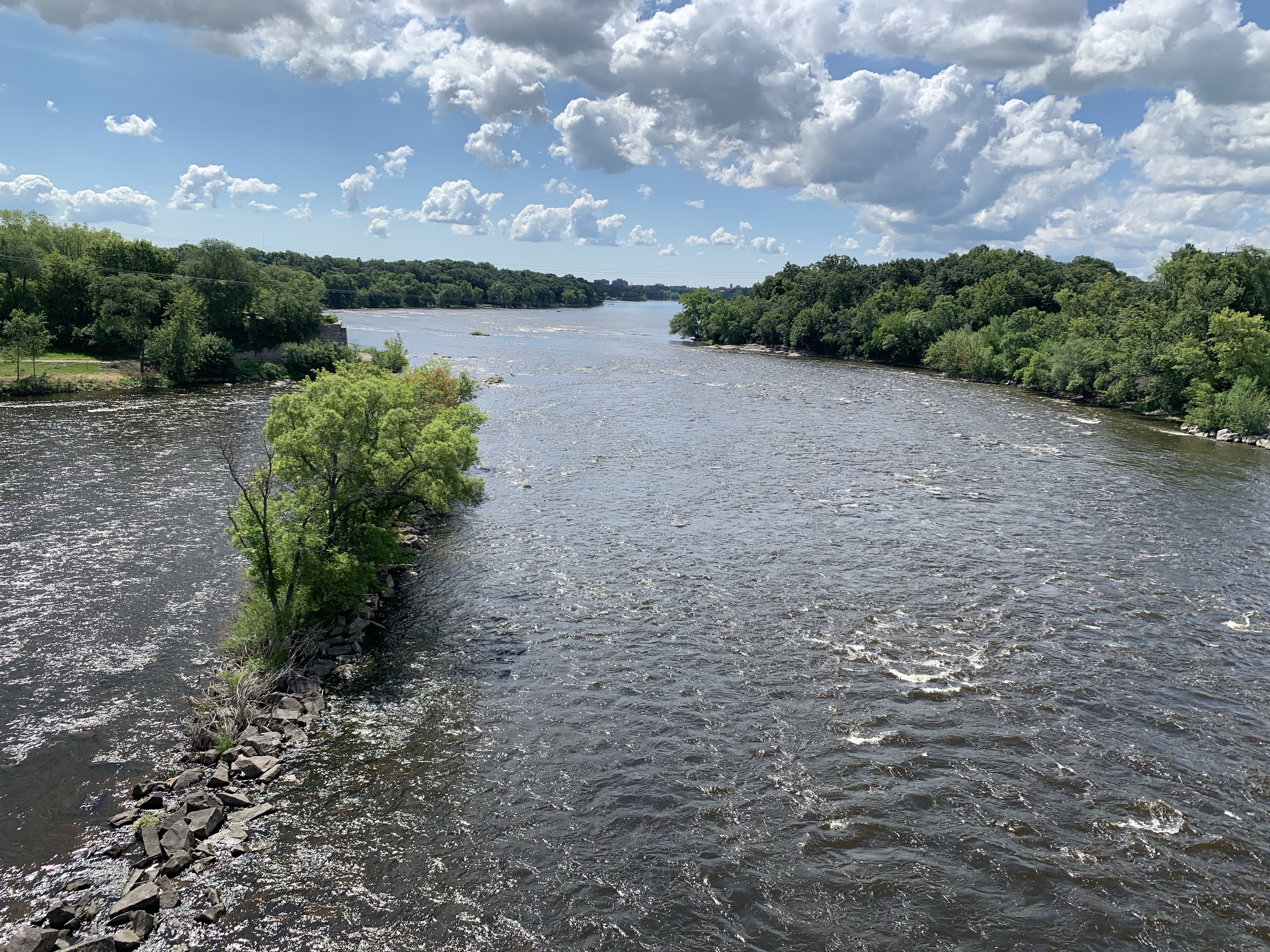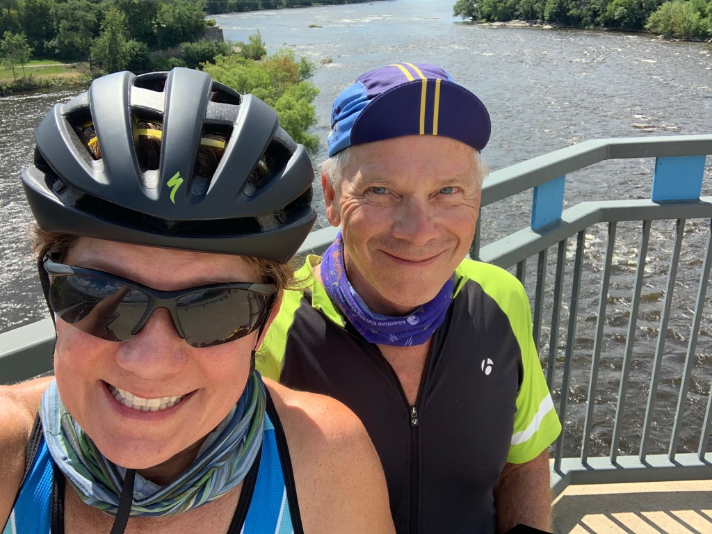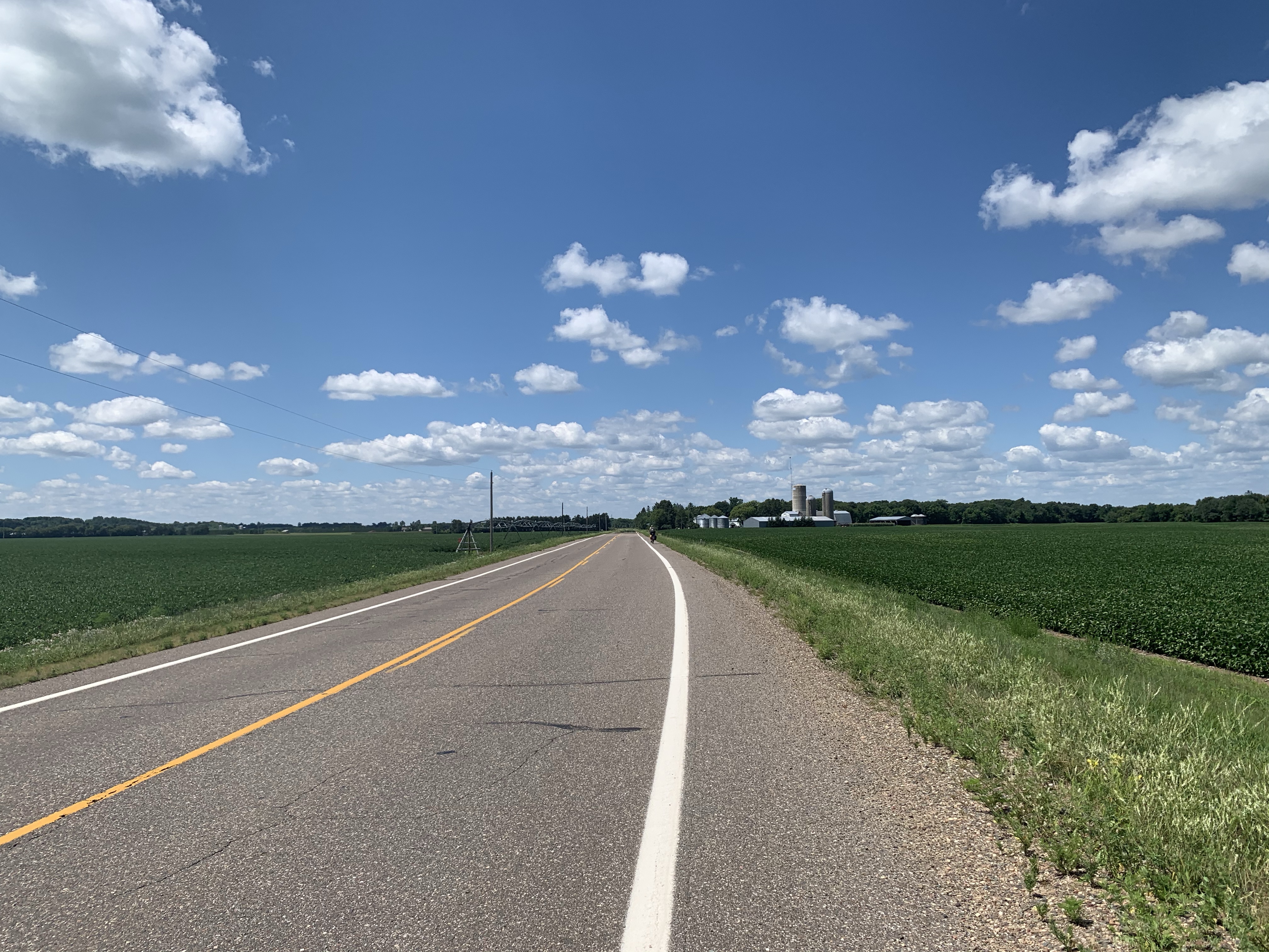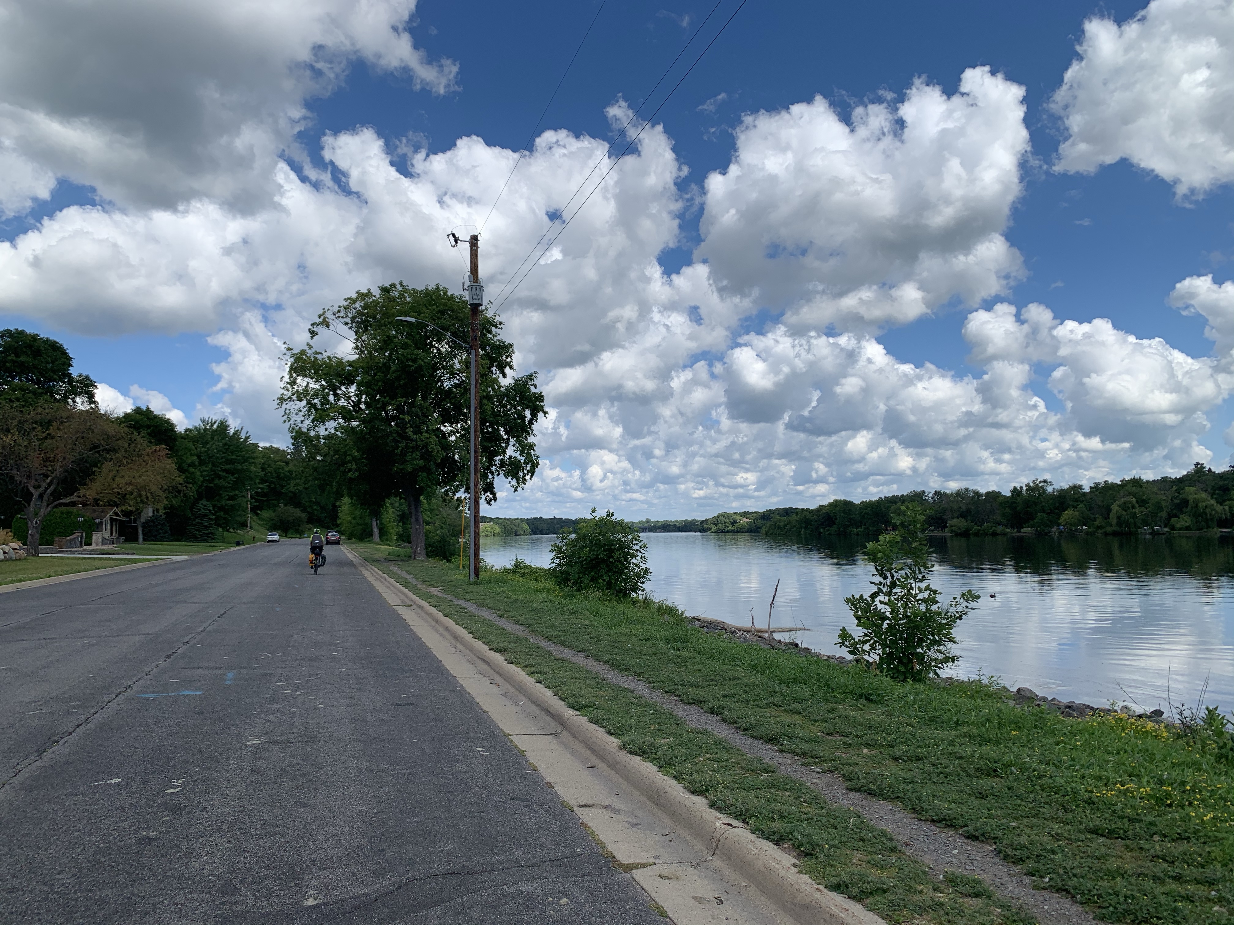Much of the day was spent pedaling on roads near farms and fields and neighborhoods with lovely homes along the river and there was an unexpected trip through the campus of St. Cloud State University which was strangely quiet as is true of all college campuses now and then more river homes and farms and it was hot and sunny, and we had lots of stops for cold water along the way.