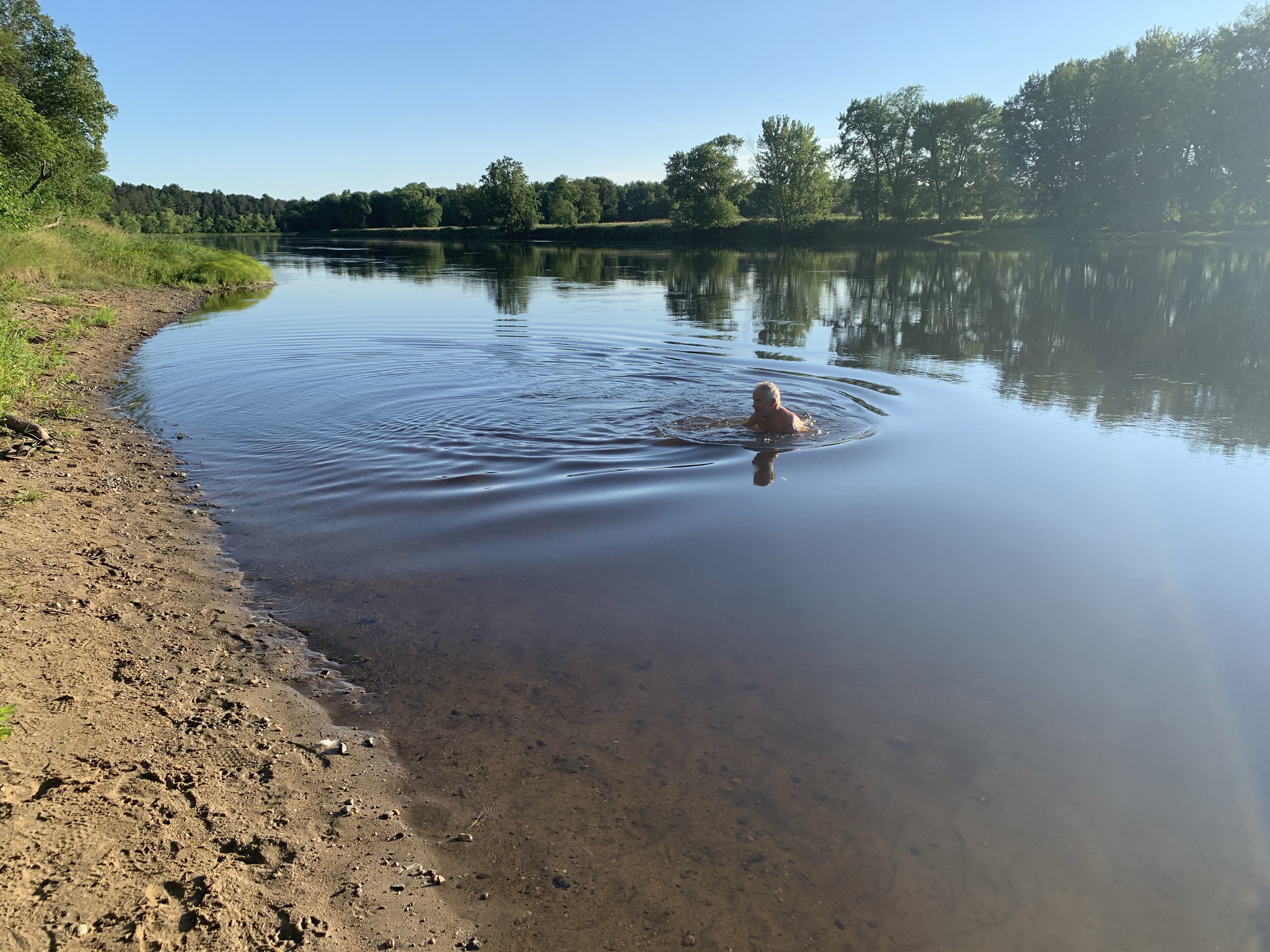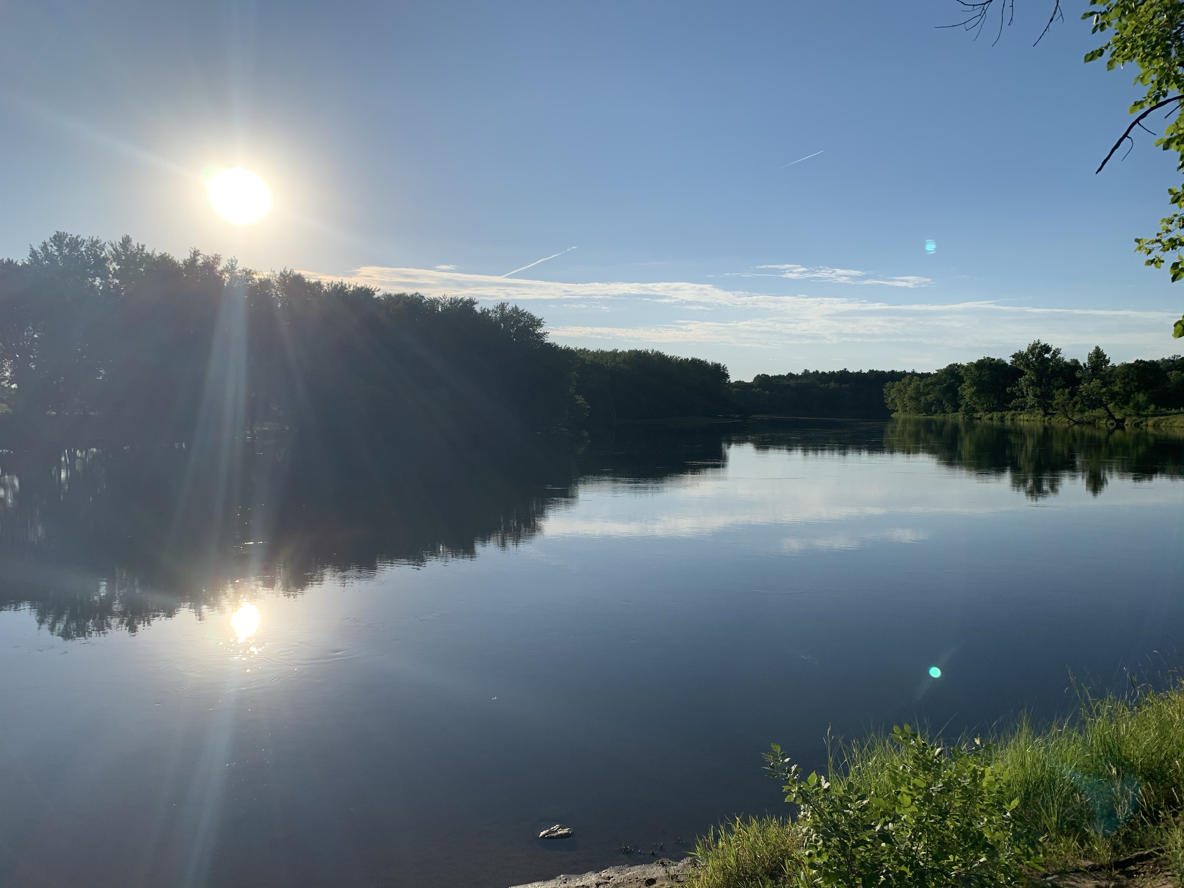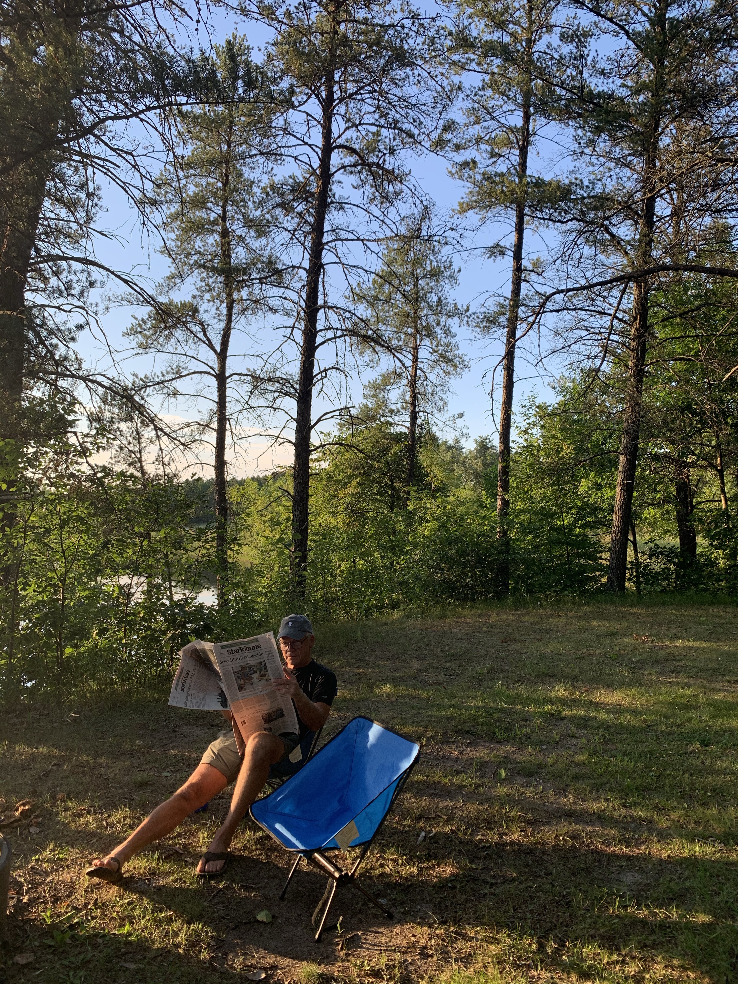 We finished our ride Friday with a white knuckled trip along highway 371 along with all of the weekend “up North” people hauling campers and boats and sometimes RVs pulling both cars AND boats, and we were relieved to get to Crow Wing State Park and to this lovely campsite on the river.
