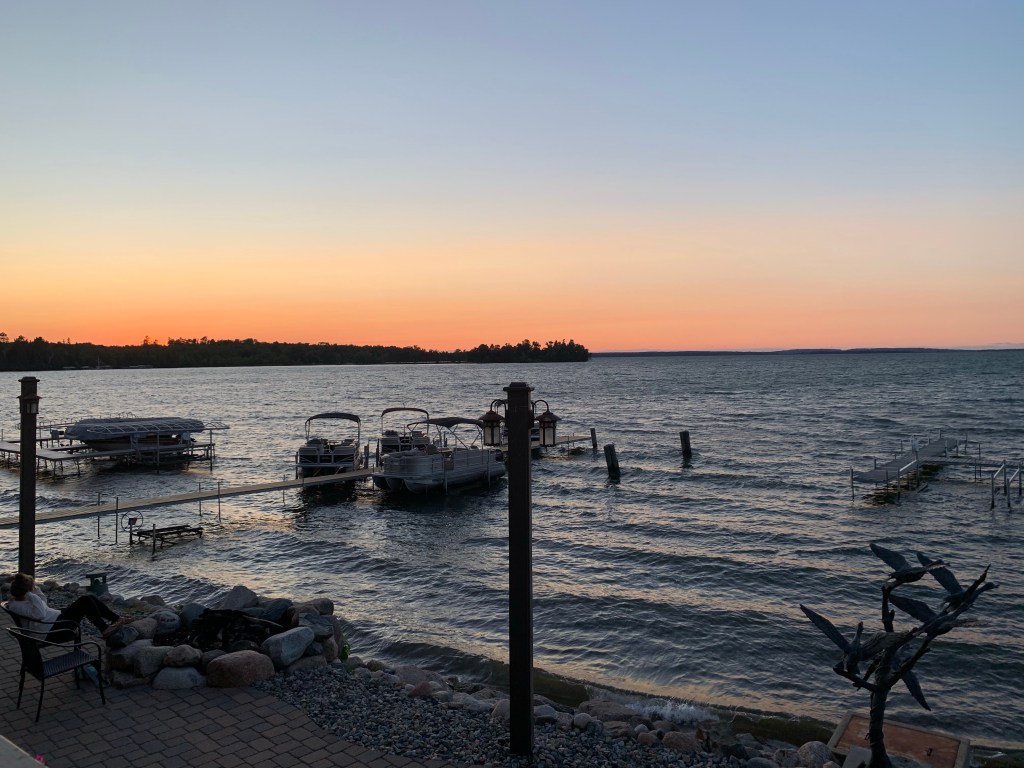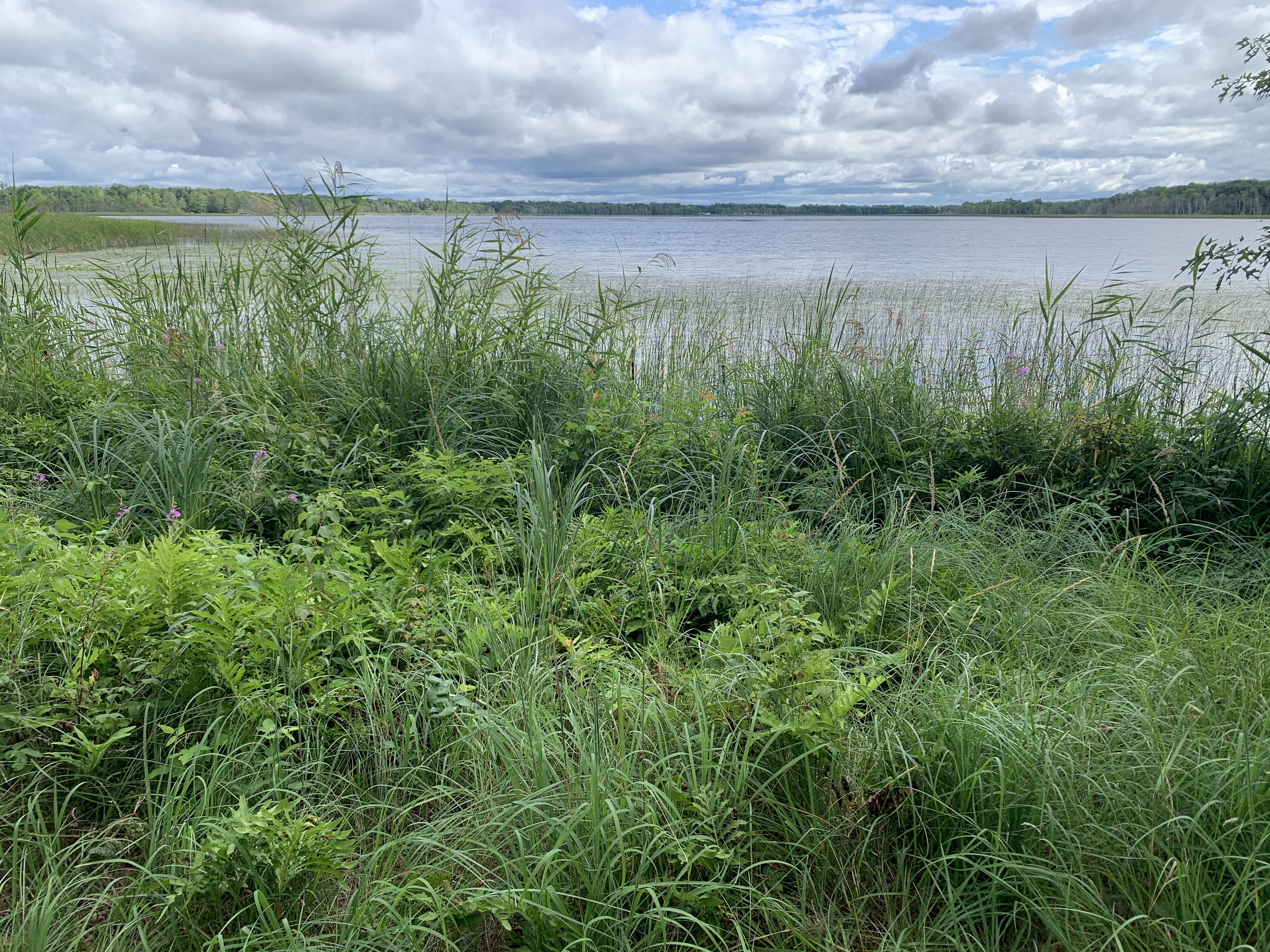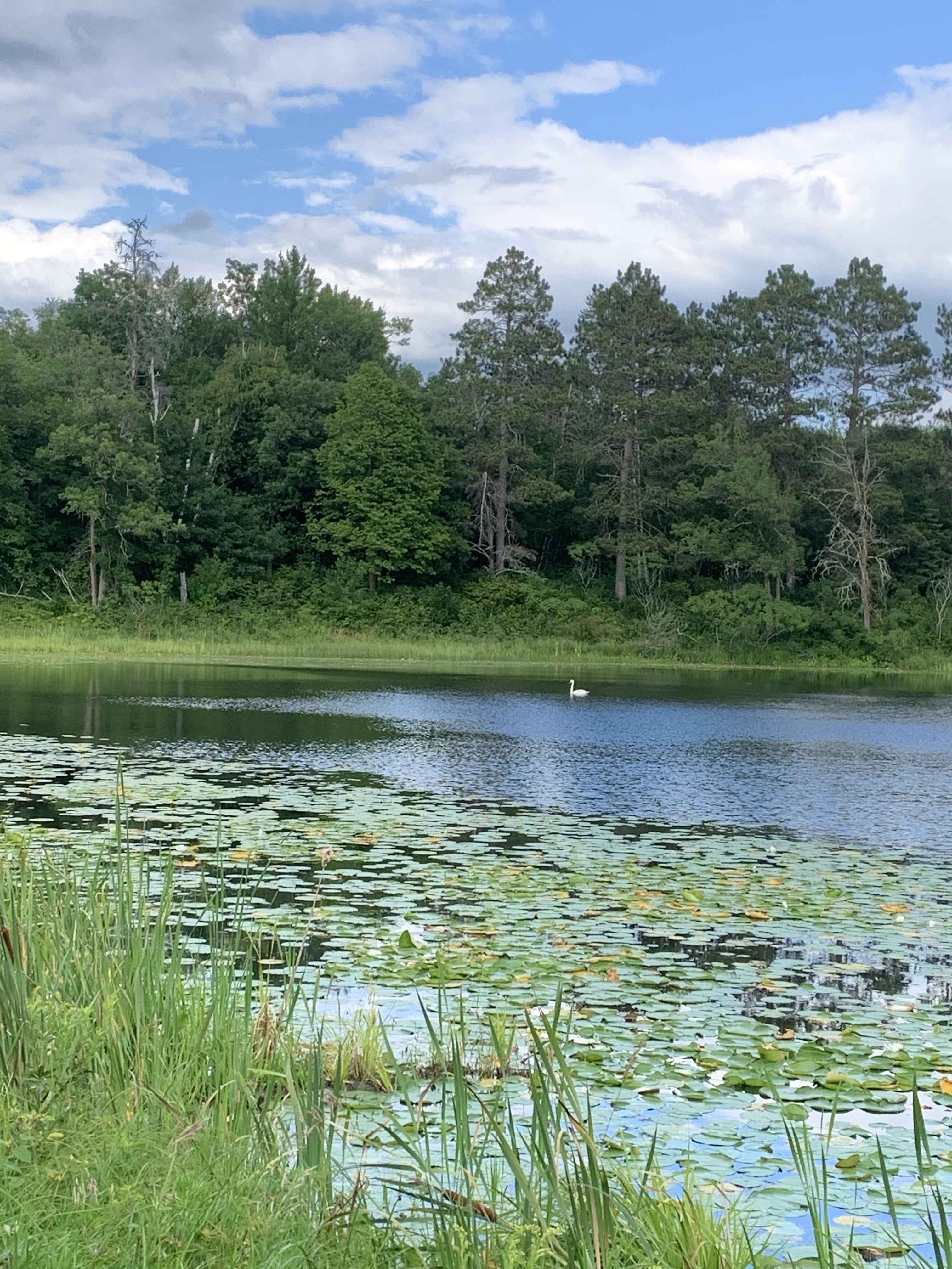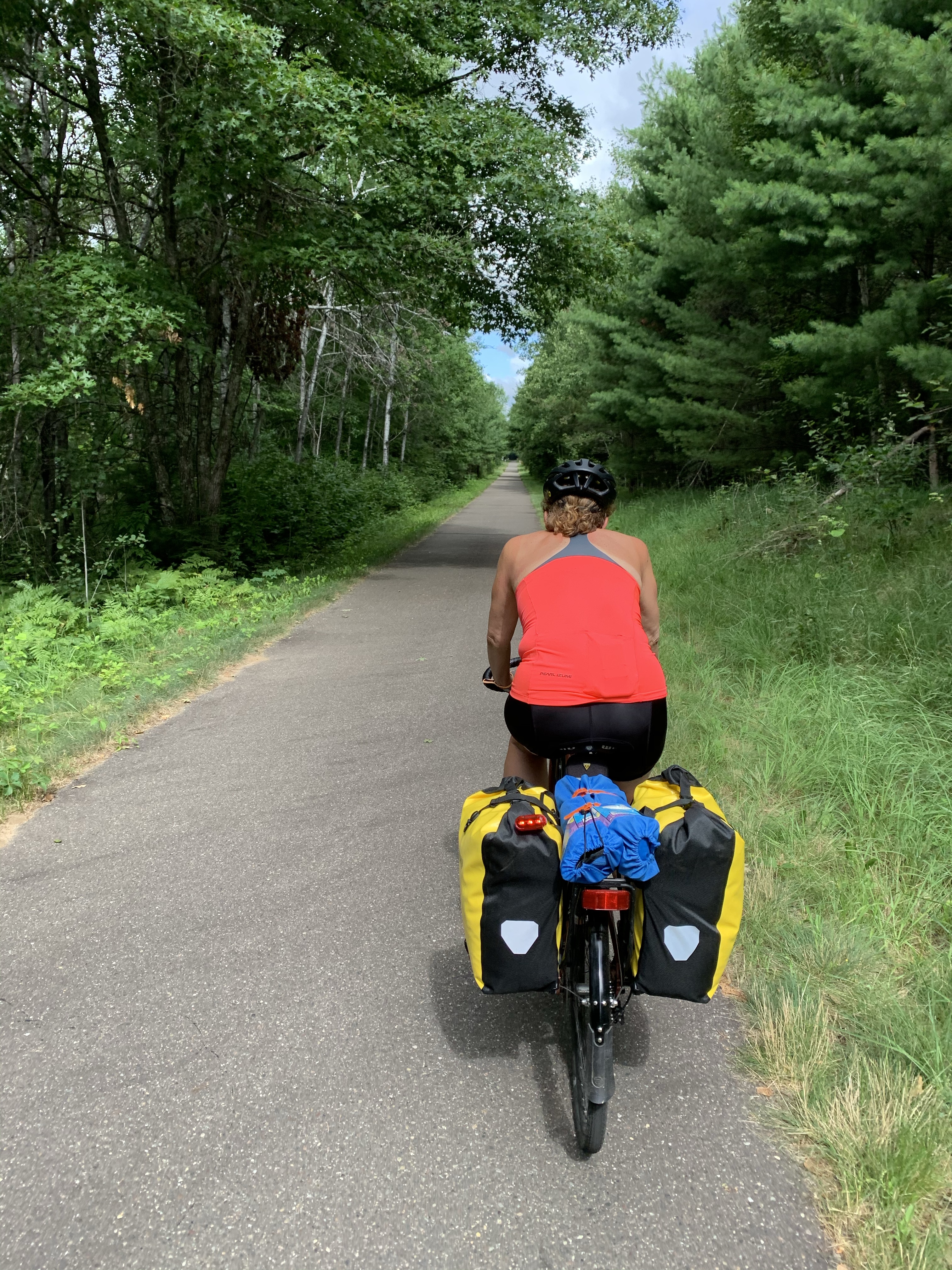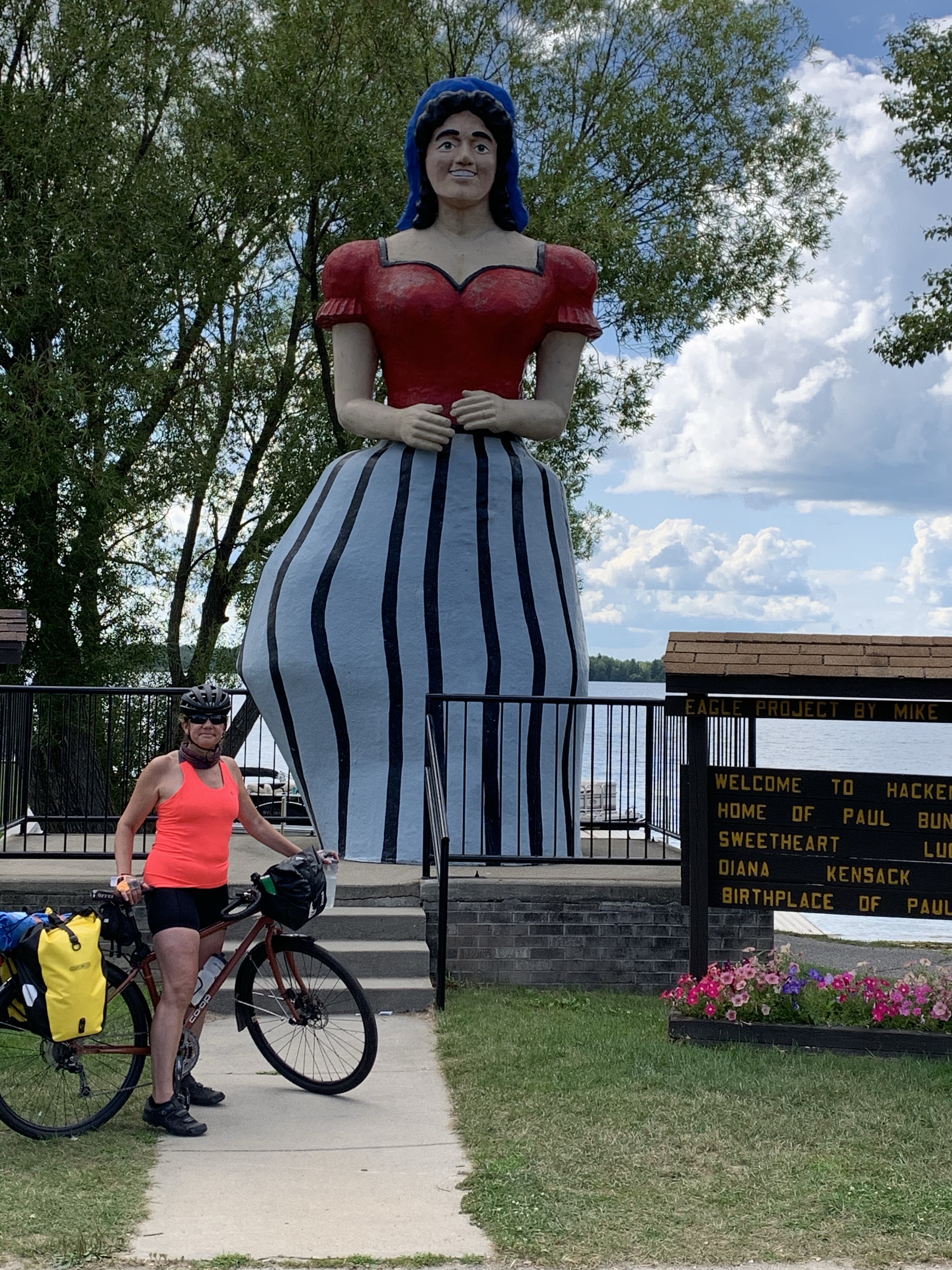 The next day we started our travels on the Paul Bunyan Trail, through the Brainerd Lakes area, with a stop for a late breakfast in Nisswa and miles of pedaling through lakes and pine trees and cattails and black eyed Susans. Made it to Walker where we pedaled into the wind along Leech Lake and settled in to our hotel, where the masked proprietor Mr. Mehta kindly let us store our bikes in the unused pool area and when we said “we may need them again to go for dinner” he said “you can easily walk to all of the delights of this town.”