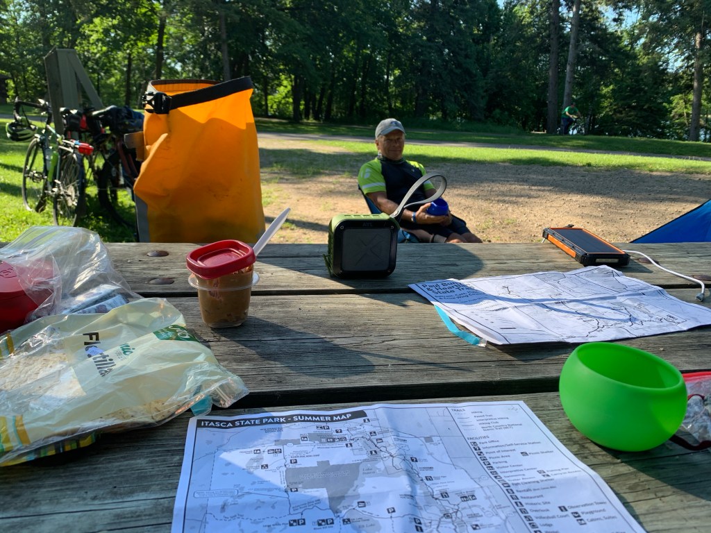 We didn’t have far to go on our last day so I felt fine not packing up and focusing on ‘making good time’ as my dad used to hope for on our family trips. Our breakfast was tortillas and crunchy peanut butter, and it was delicious. Our route was going to take us out of the park and back to Laporte, then north on the Paul Bunyan Trail to Bemidji and a hotel right on the lake