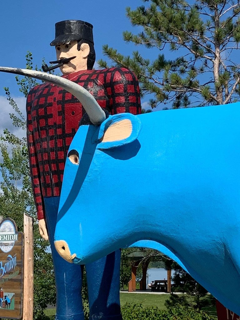 We left the park and got out on Highway 71 back to Laporte. We hooked up with the the Paul Bunyan Trail to ride north the last seventeen miles into Bemidji. As we entered town, I asked a couple of skateboarding boys where Paul and Babe were and they pointed and told me how to get there and it went quickly and then we were standing by these statues which have been there since the 30’s. I know have stood in that place many times. A nice couple helped us by taking some pictures and we did the same for them.