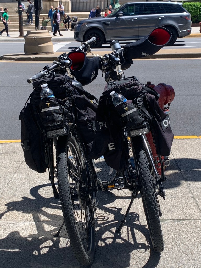 Our one bike encounter for the day was when some Chicago PD bike officers rode up to Starbucks on Michigan Avenue while we were sitting outside and parked them next to us, then handcuffed the bikes together while they went in for some coffee.