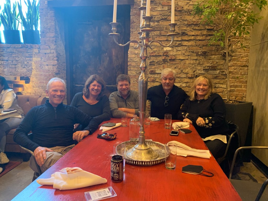 The highlight of the day was meeting up with crazy cool college friends Mike and Jane for brunch at the Fulton Market Kitchen together with their friend David, who is the brother of our friend Cindy back in Minnesota, as well as a familiar journalist from National Public Radio; we were delighted to finally meet in person after hearing his reporting for years. It was lovely to have a meal and conversation with smart people at a great restaurant…and our waiter kindly took this photo of the candelabra on our table, with us in the background.