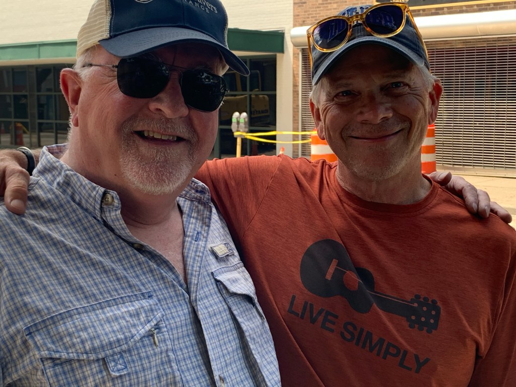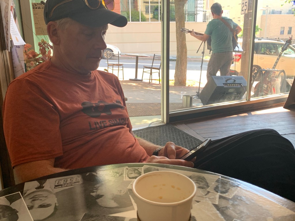 Seeing the city in the morning sun made me think that the place has some potential – if they can come up with work for people to do. Larry and Holly were going to meet us at noon so we had a leisurely morning, with breakfast at a place called Mugshots with great coffee and a busker outside— and posed for our mugshots as the lawbreakers that we are — and took a walk along the Ohio River afterward in the sunshine.