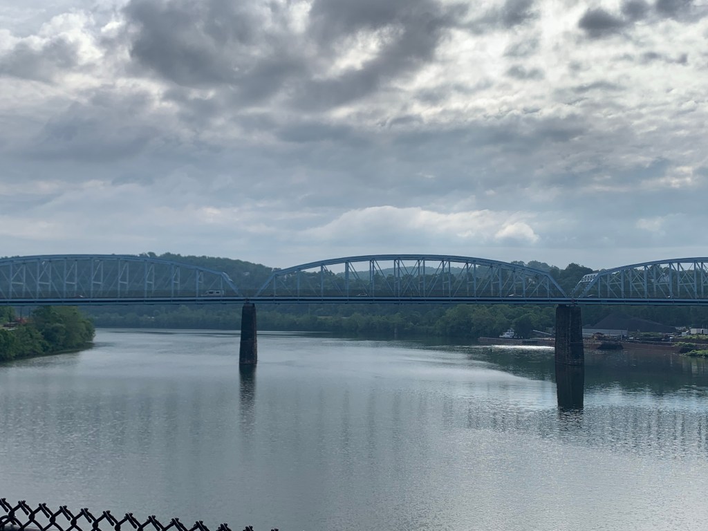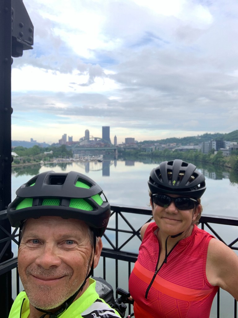 We got a good start today from our nice little Air BnB in the Deutschtown neighborhood in Pittsburgh, riding down rain wet streets and across the Andy Warhol Bridge and through downtown to the Great Allegheny Passage trail, which runs about 150 miles to Cumberland, MD.