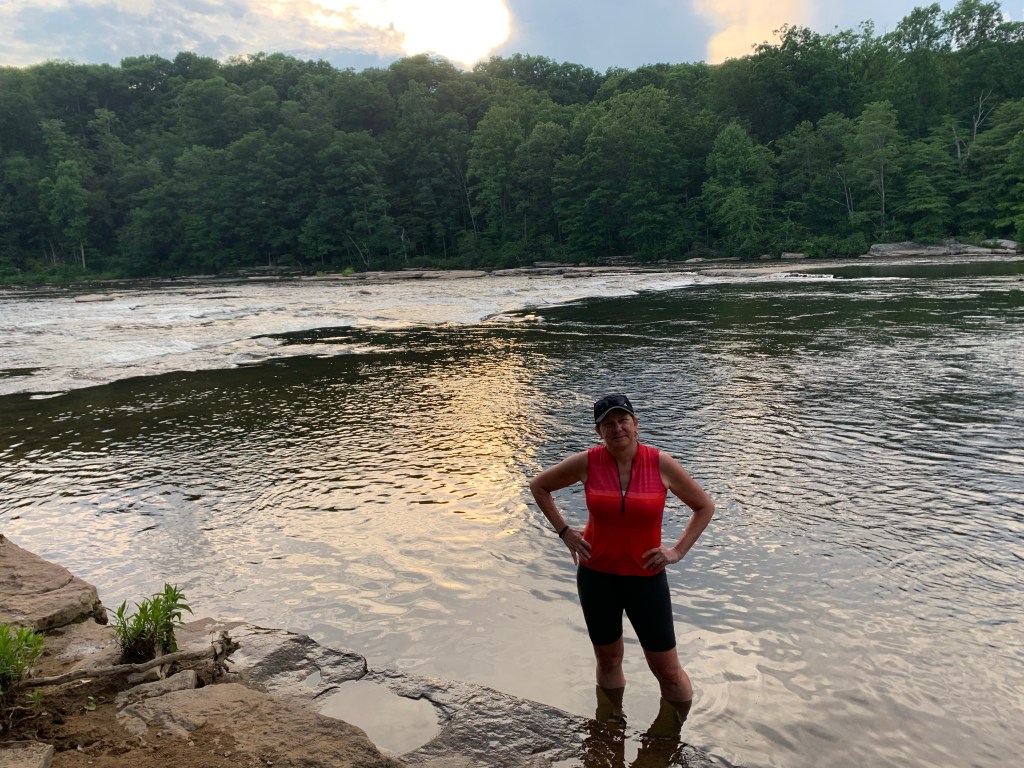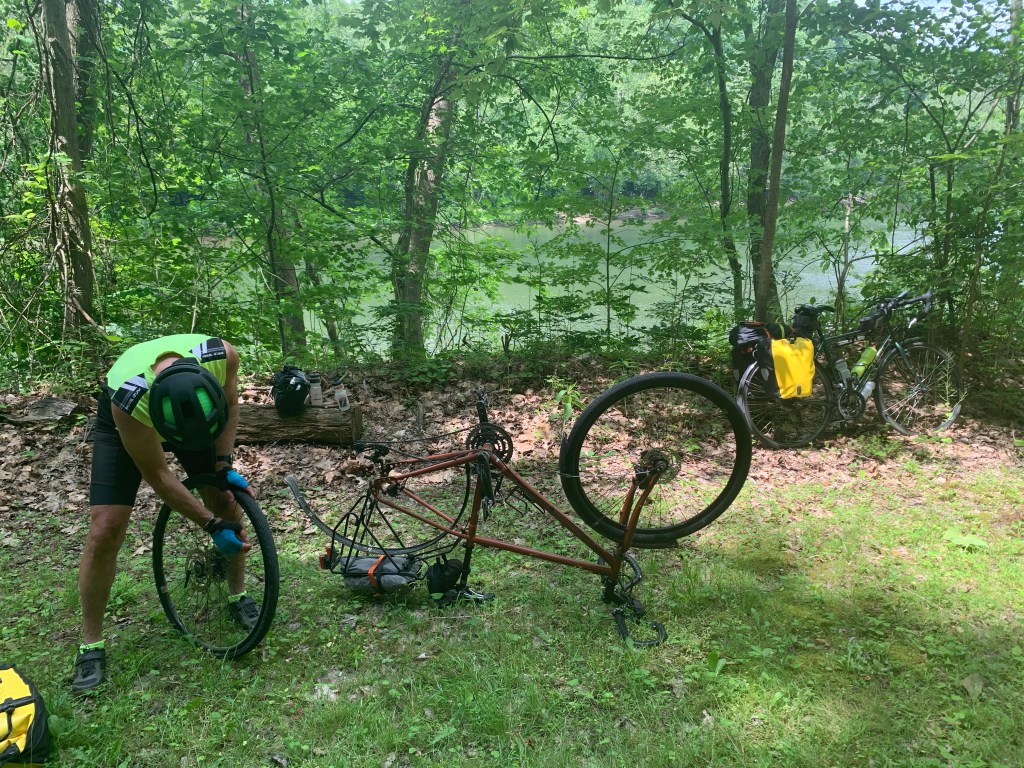 We pulled into Ohiopyle around 5:00. I’d been here once before, on a road trip in a car. In 2007, I took my dad along when I went out to pick up Arne from NYU, and went down to DC, and then came back this way so I could take my dad (an architect) to Fallingwater, the Frank Loyd Wright house which is just a few miles away. I remembered the town well, as it is in a beautiful setting.