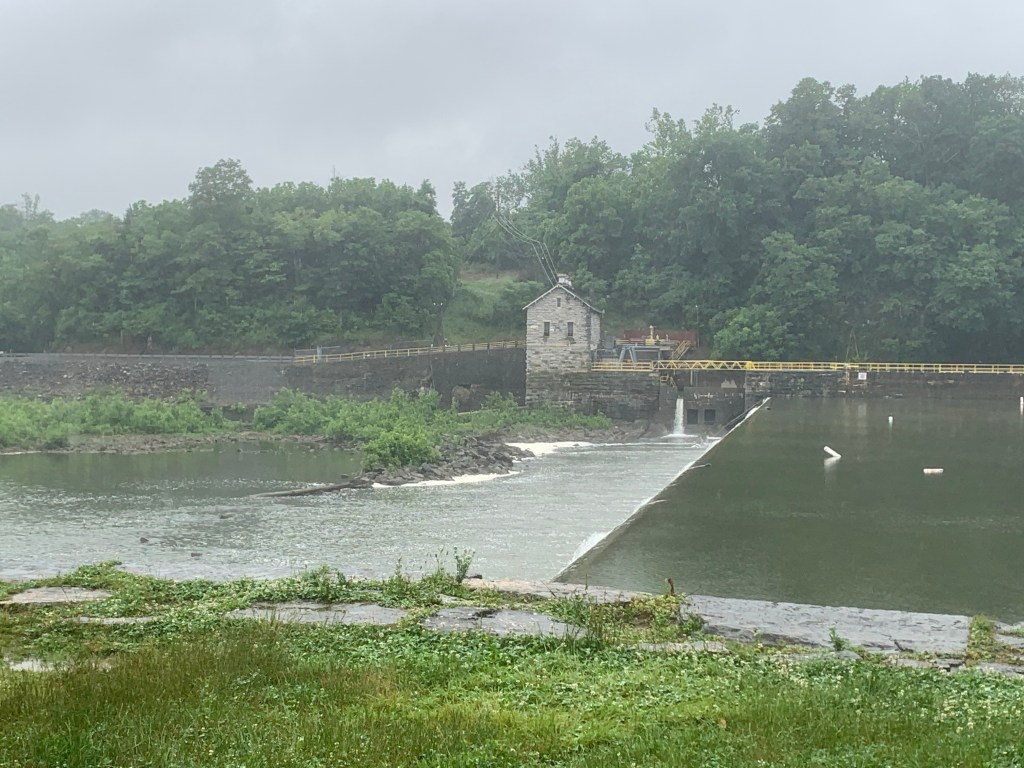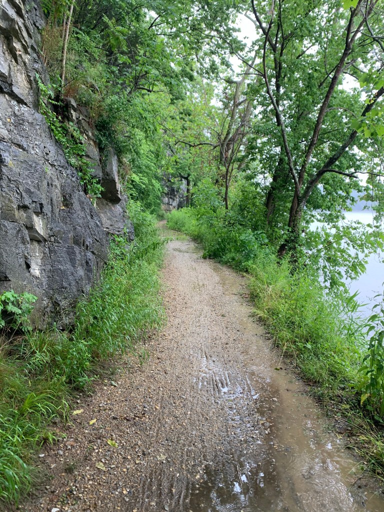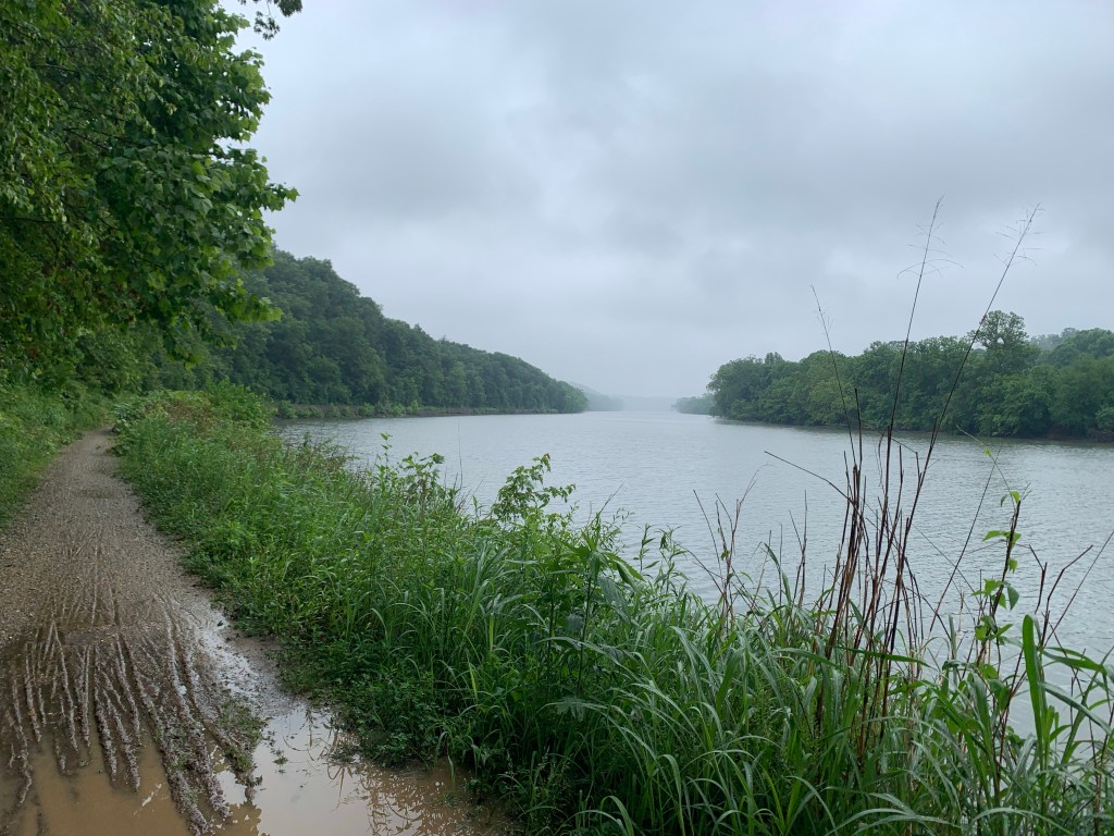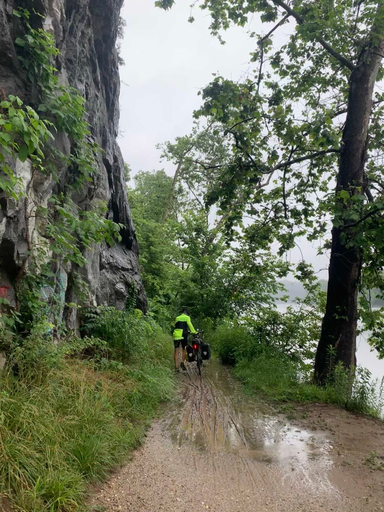 As we rode down the path, the rain got heavier. The trail surface was better than it had been just out of Cumberland, but the puddles were growing. At one point, the trail hugged the side of a cliff, on a man made concrete walkway, about ten feet wide, with a low curb, then a ten foot drop right into the river. I decided I might have a little fear of heights, and I rode as far from that drop as possible, thankful there was no oncoming bike traffic – but then, who besides us would be out riding in this weather?