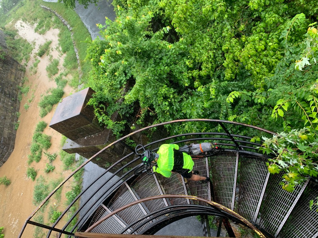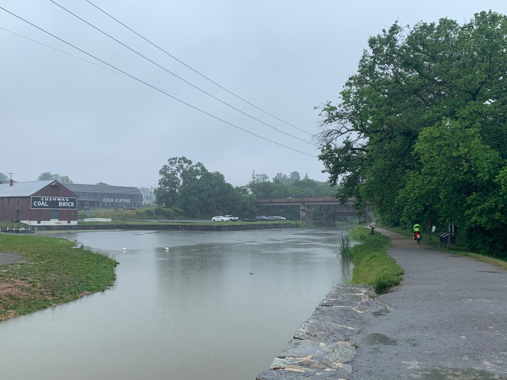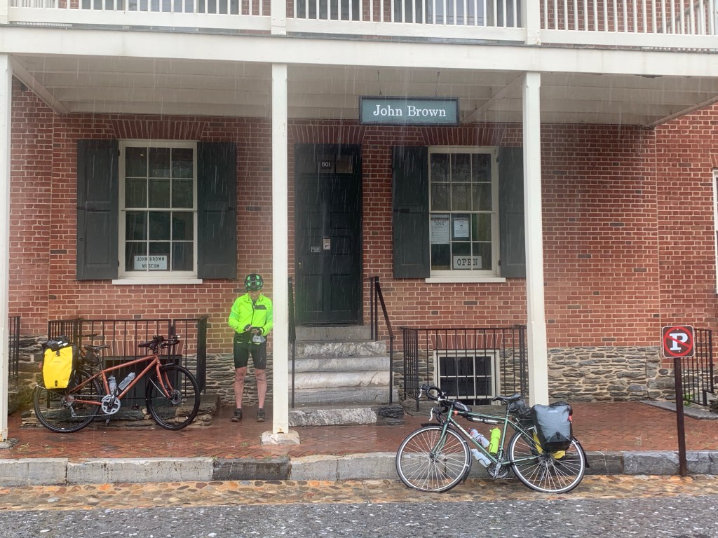 Once we were back on the trail, we only had a few miles to get into Harper’s Ferry and rode as fast as we could through the downpour. We knew there was a big railroad bridge to cross (over the Potomac) and would have to climb a number of stairs with our gear to get there – a portage, sort of – and when we got there, the canal was overflowing. We carried all our gear and bikes up the steps to the bridge and walked over to the town and saw the confluence of the Potomac and the Shenandoah – a sharp line between the two, one tan from the storm runoff and the other a more normal greenish grey.