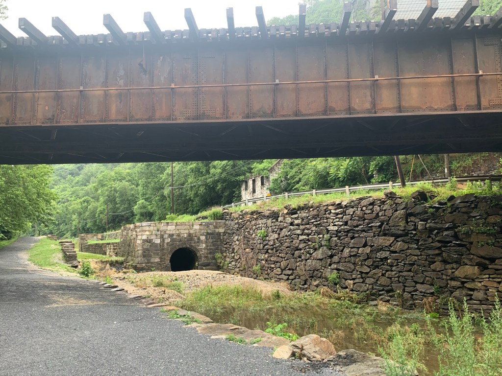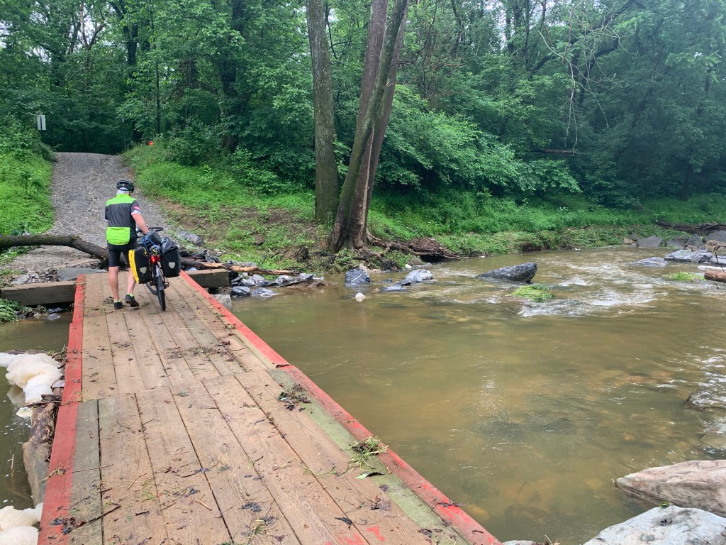 We had to go back over the Appalachian Trail bridge and portage our bikes and bags down the stairs to get back to the Chesapeake and Ohio towpath, which was much easier without pouring rain. During the ride we crossed several bridges that clearly had been underwater during the previous day’s downpour.