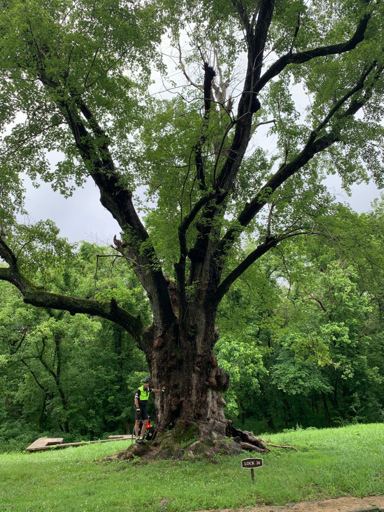 The conditions were pretty good and we only had 60 miles left in our 1400 mile journey, and we were riding fast for us (10-11 mph was a good pace on this trip given the weight of our gear). The plan was not to stop for lunch or much else, but we did take a break to when we saw this immense maple tree…and sat on the remains of the old lock house there to eat some fruit, and marveled at all that this tree must have witnessed in its hundreds of years.