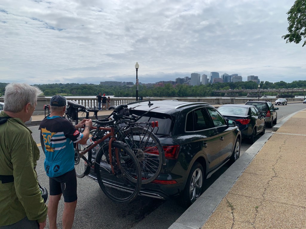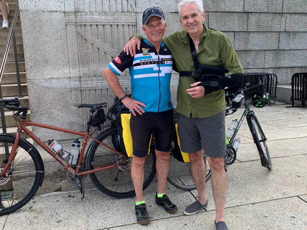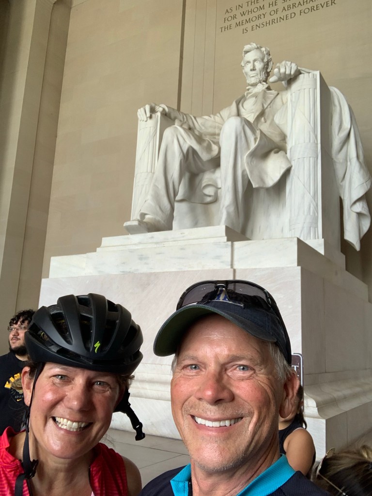 We could see the Washington Monument in the distance as we biked along the Rock Creek Parkway and were delighted to see Dan’s brother Tom on the sidewalk across the street as we were getting closer to the Lincoln Memorial, which was our end point. Tom joined up with us and there were lots of hugs (careful ones because of his shoulder) and we pressed on.
