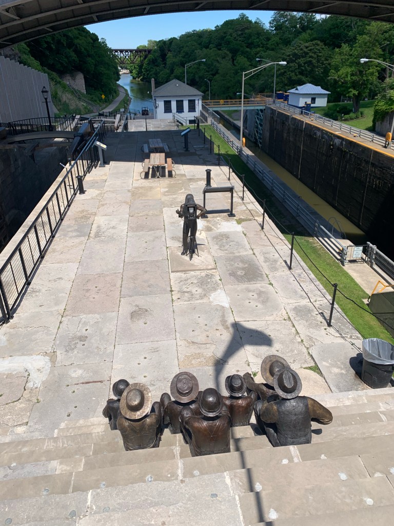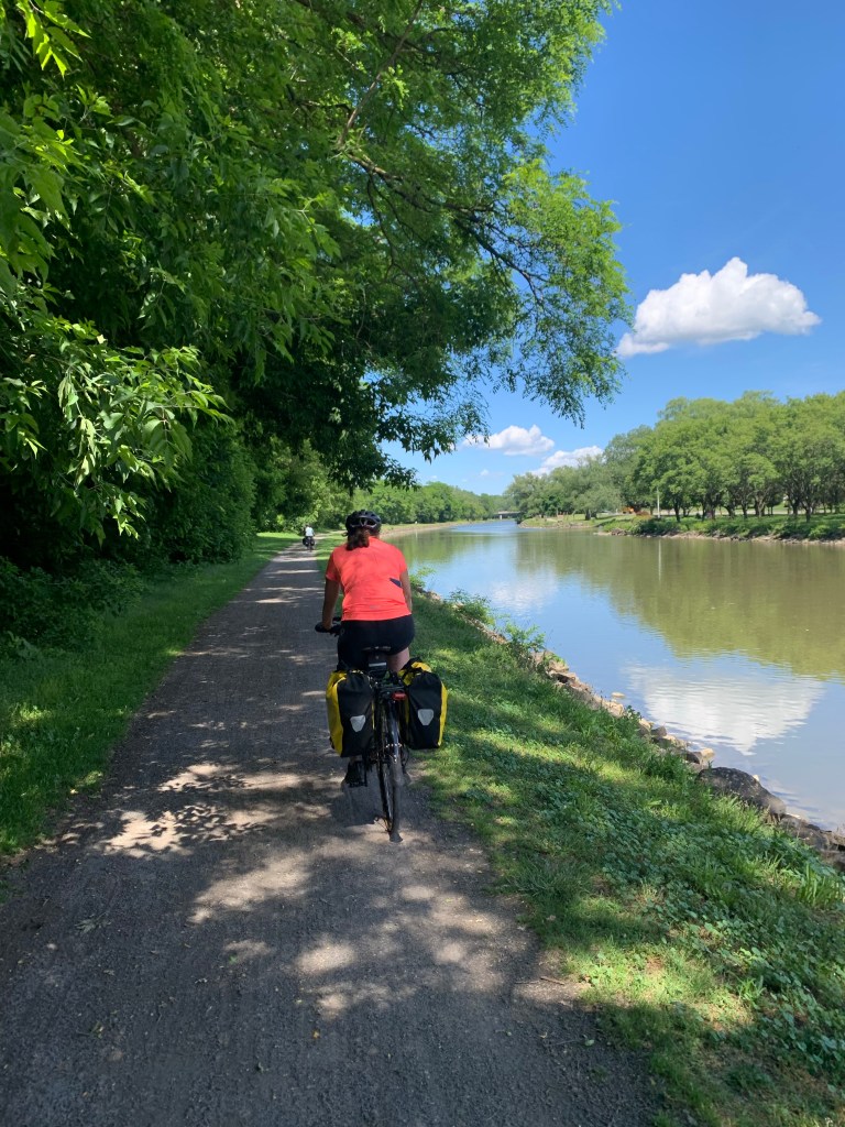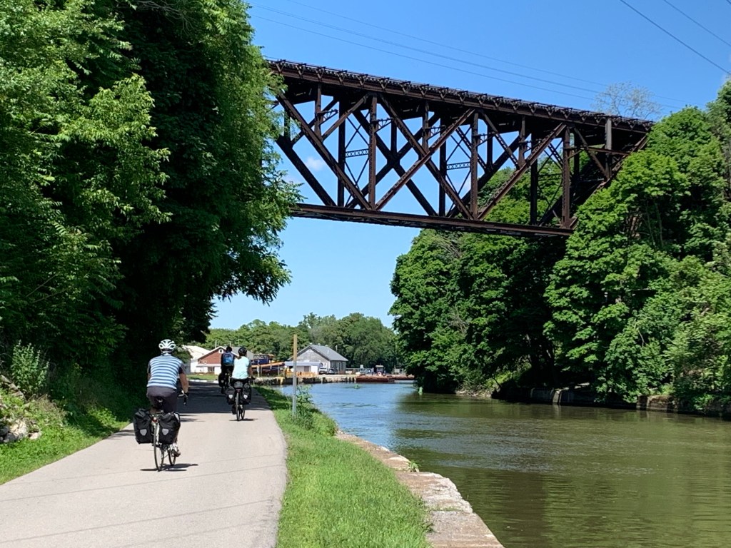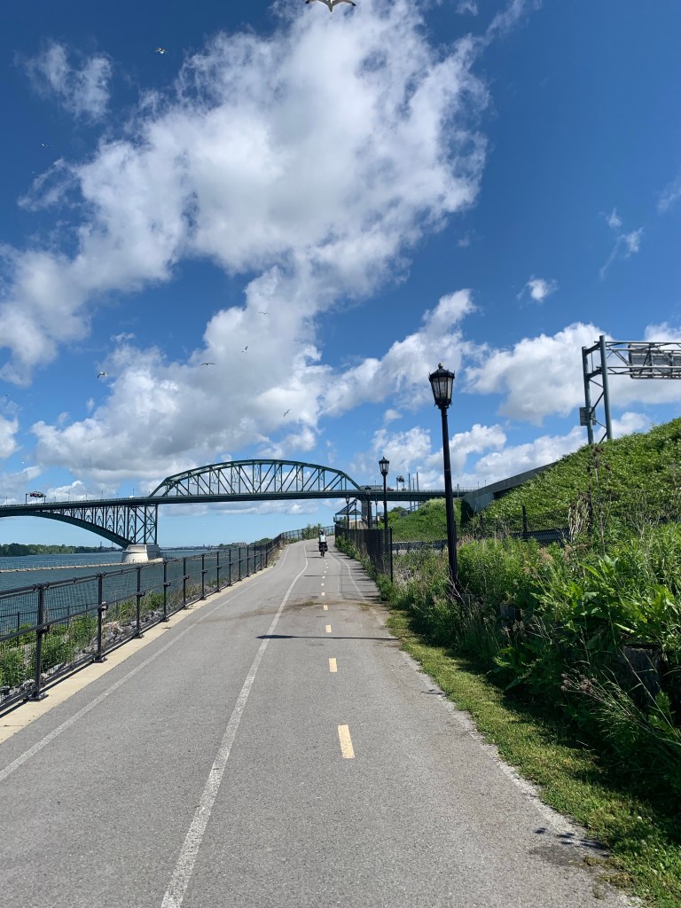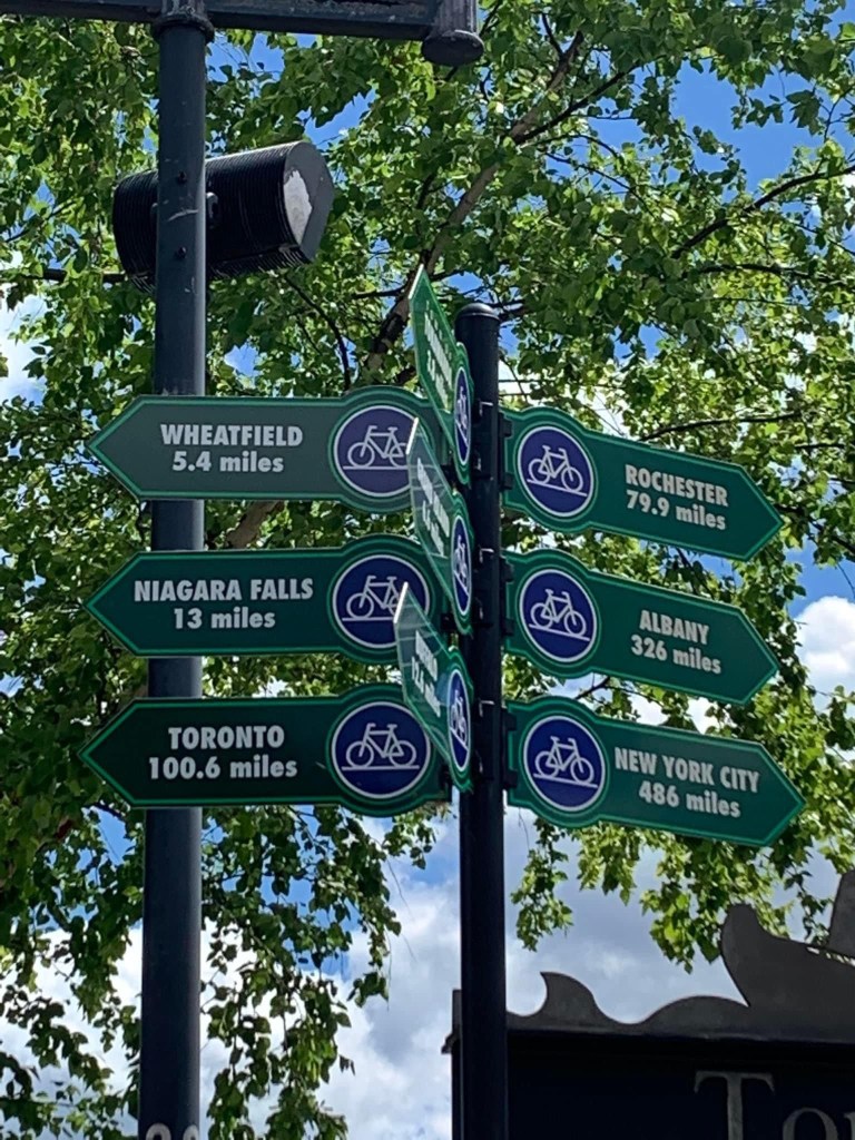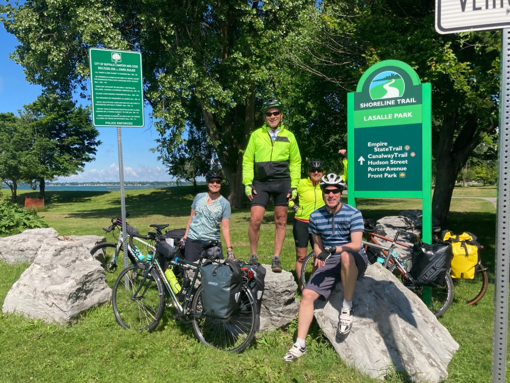 Lisa and I woke up and drove the car to a ramp across the street from the Buffalo station where our train from Penn Station will drop us off in ten days. We walked back to the hotel and had breakfast before heading out on our first day’s ride. The weather was perfect and we rode down to the shore of Lake Erie and then along the Lakeshore Trail and the mighty Niagara River up to Tonawanda to the western end of the Erie Canal.