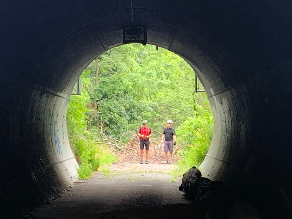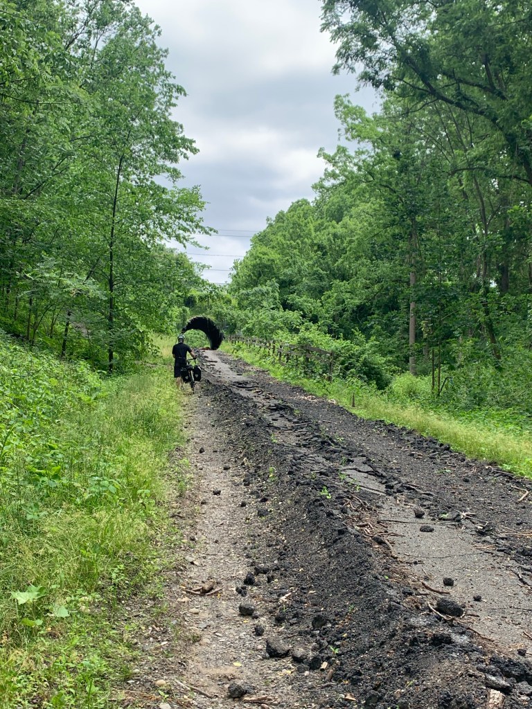 As we came through the town of Cohoes, the trail suddenly broke up and we had to walk our bikes as long as we could and then reached a tunnel full of logs and beyond that, brush covering the entire trail. We decided that someone had forgotten to put up a detour sign. So we figured it out, as we must do in these situations.