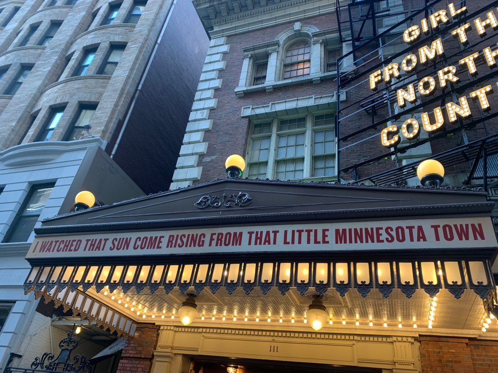The Minnesota place names in the play delighted us, and the show went by so fast. At intermission, we chatted with a woman by the merch table – she was assistant lighting director. I asked her if Dylan had come to see the show and she said that she thought he’d seen an earlier version done by the Public Theater before it opened on Broadway.