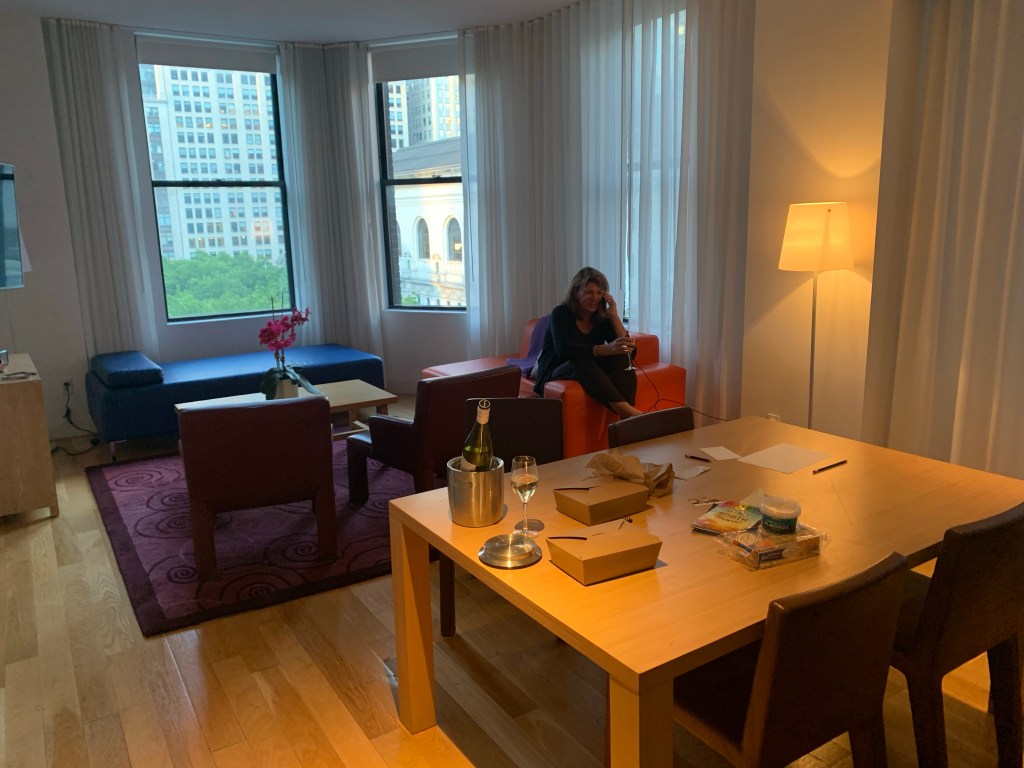 After soaking up the scene for a few minutes, we walk/rode over to Bryant Square Park, just a few blocks away. We like that park, with its grass and trees and flowers and the New York Public Library. It is close enough to Broadway theaters to walk, but just far enough from the craziness of Times Square. We awkwardly got through the doors of the hotel and leaned the bikes against a wall and walked over to the reception desk, where hotel staff Scott and Zaaul were staring at us. I greeted them and said we’d just finished a 600 mile bike trip from Buffalo. They had lots of questions about bike travel and what we were doing, and eventually asked “Wait, do you have a reservation here?” I said “YES! We like to have a nice hotel at the end of our trips and this is it! This is our reward.” I asked about storing the bikes in their luggage storage area, and Scott immediately said “Well, since we’ve never seen this before, I’m going to upgrade you to a larger room.” I asked if there would be room for our bikes (knowing how big the typical Manhattan hotel room is) and he said “Oh, there is room for thirty bikes in this one!”