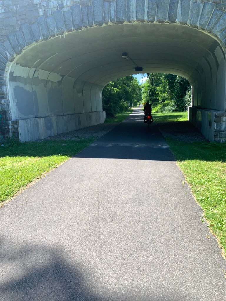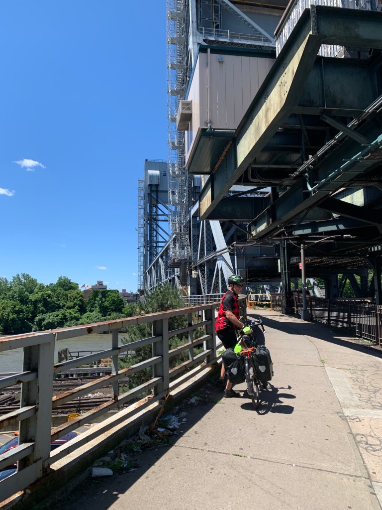 But those 25 miles involved riding right into the heart of one of the biggest and busiest cities on earth….! We had good maps, still following the Empire State Trail and Hudson River Valley Bikeway signs. It was a beautiful Sunday, Father’s Day, and it seemed like half the city was out on the trails and in the parks as we rode south to Van Cortland Park on a nice asphalt trail. The Sunday morning biking guys were zooming past us at 20 miles an hour, and families were out for a stroll, some with dogs. It made for a ride that required all of our attention. After riding through Yonkers, we ended up on streets in the Bronx, and after a couple of wrong turns, found ourselves walking across the bridge over the Harlem River, officially taking us into Manhattan.