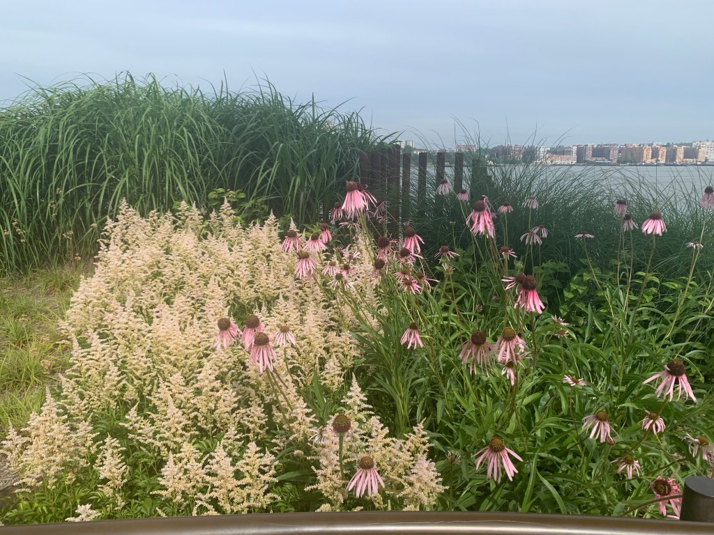 The first encounter we had on the bridge, by the way, was with a rat. I wish I’d gotten a picture of him/her. It wasn’t as repulsive as I’d expected – kind of cute, in fact. After getting back on the trail, we rode along the Hudson, through Riverside Park, below the Cloisters and by Columbia University and the Upper West Side. We watched the street numbers count down, from the 100’s to the 80’s and lower, as we dodged ebikes and escooters and pedestrians and looked at New Jersey across the river. We rode under the George Washington Bridge and remembered biking here in 2018 when we rented bikes and circumnavigated the island on a similarly beautiful day in April.