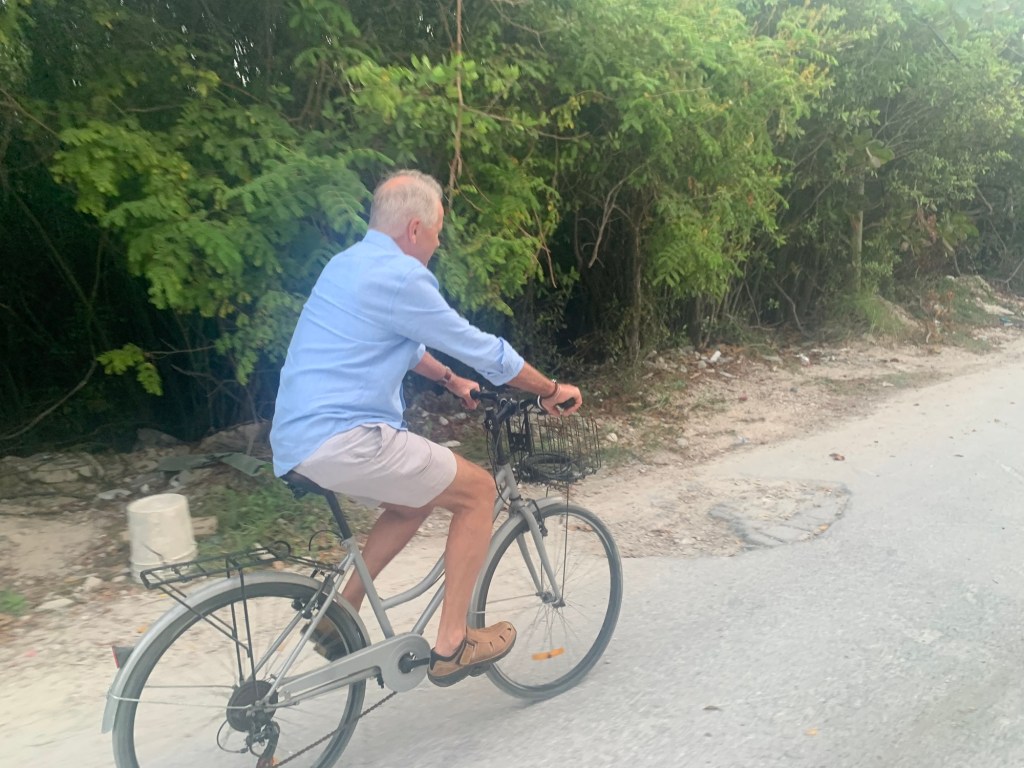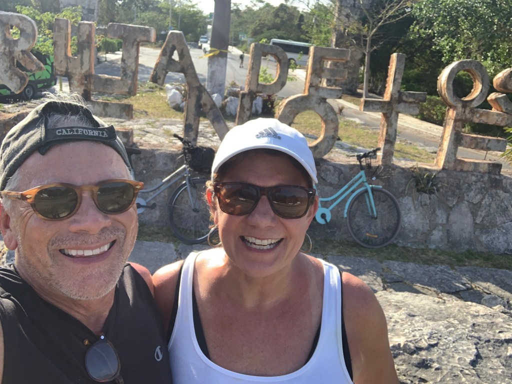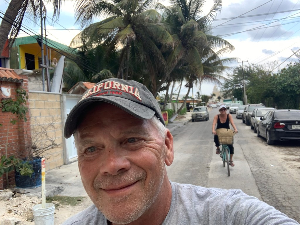 We couldn’t get to Mexico until the last week of April, and intended to celebrate Lisa’s birthday there. We booked an apartment on the ocean and looked forward to long walks every day on the beach, something we always do when in St. Martin, which is about 1,500 miles straight east of the Yucatan Peninsula. As it turned out, it was impossible to walk on the beach directly from our apartment, as the big dock that makes Puerto Morelos a port was between us and the main beaches of the town. We did not rent a car on this trip, but we did rent two bikes, which we used every day to ride into town and then do our beach walk.