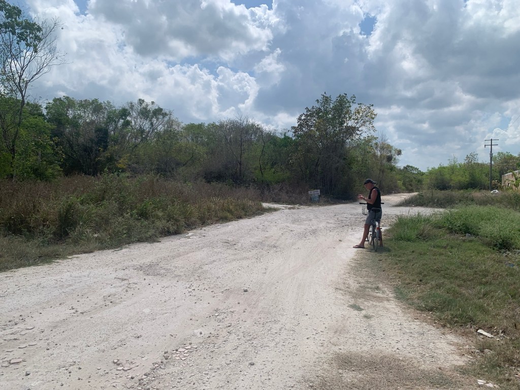 We packed up our swim suits and a few other necessities, and took off. The ride into the old part of town went pretty well, including getting under the freeway, the busiest intersection by far. We’d google mapped the route for bikes, and it took us out of town to the west on a different road than the Ruta De Los Cenotes, which might have been a clue for a wise biker. After getting turned around in town a couple times, we located the road out to the west. It started out as a paved road, but quickly and dramatically deteriorated into a potholed, rocky and barely passable trail. As we rode farther out of town and away from people, we became more and more deeply immersed in the jungle with no sign of civilization, other than vague roads/driveways disappearing into the woods on either side. I wondered what we’d do if our bikes broke down or developed flats – which was highly likely, as a matter of fact. I pondered drug cartels, meth and fentanyl labs at the ends of the roads on either side, guarded by vicious dogs. (I had no evidence that this was the case, but my imagination was working overtime.) At one point, Lisa said that a black SUV was following us slowly, but it left us.